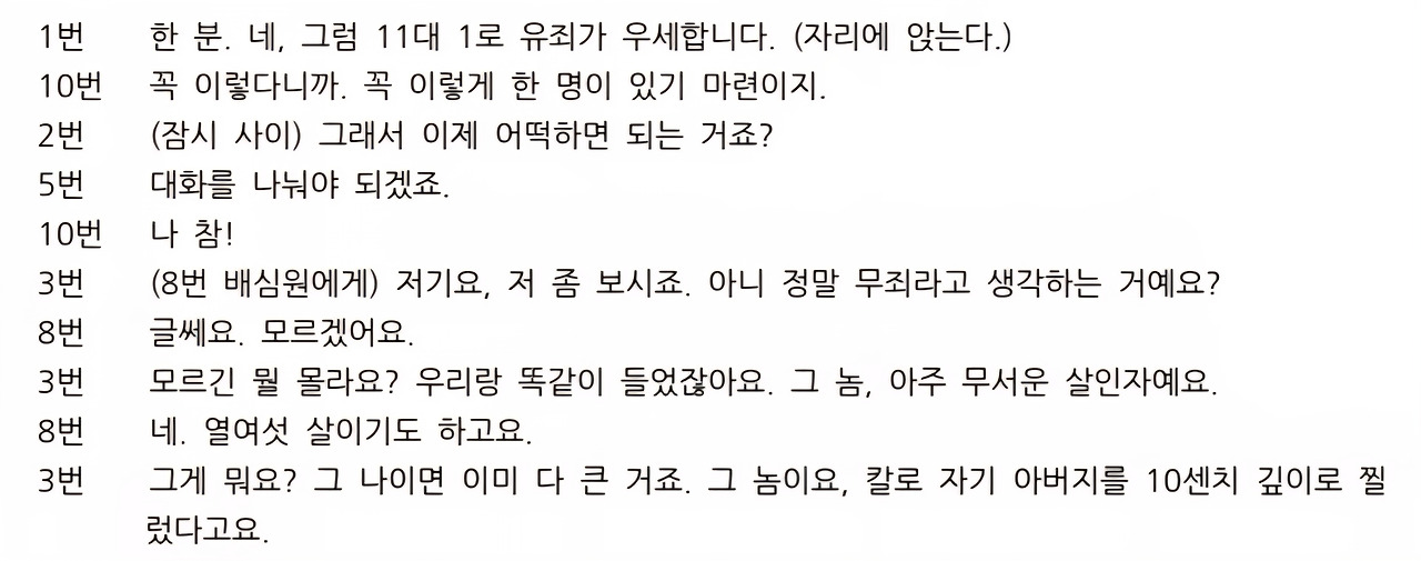 당시엔 당일 참여한 인원이 대사를 다 외웠을 것이라고는 생각하지 않아서, 대략 15~20줄 정도를 하나의 구간으로 잡은 다음, 그 구간을 다 외우면 다음 구간으로 넘어가는 식으로 연습을 진행했다. 구간을 나누는 작업은 내가 했는데, 특정 구간에서의 흐름이 뚝 끊기는 일이 없게 하면서 적당한 양으로 나누는 것이 쉽지는 않았다. 보통은 주고받는 대화가 마무리되거나 1번 배심원이 '이제 그만 좀 하시고 자리에 앉아주세요' 하며 분위기가 가라앉는 부분에서 구간을 나눴다. 심지어 연습 인원이 한정되어 있다 보니, 연습에 참여하지 않은 배우의 대사를 커버할 사람도 남겨두고 구간을 나눠야 했다. 구간이 다 나눠지면, 특정 구간에 누구누구는 대사가 없으니 미참여 인원의 대사를 해 달라는 지시를 하나하나 내려야 했다. 말로 설명하니 어려운 것 같아 아래 사진을 예로 들어서 설명을 하자면....