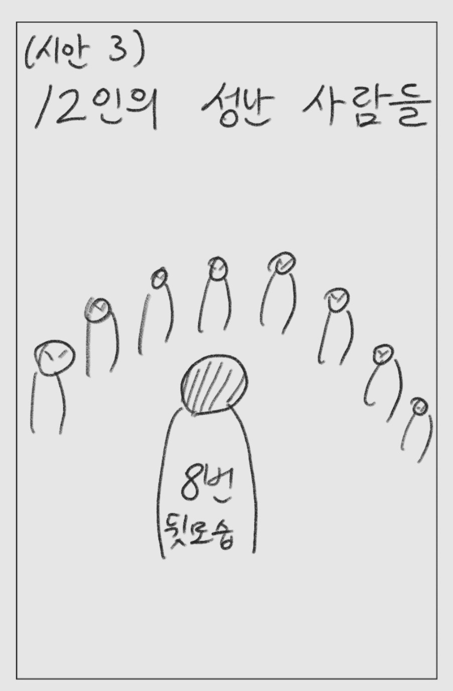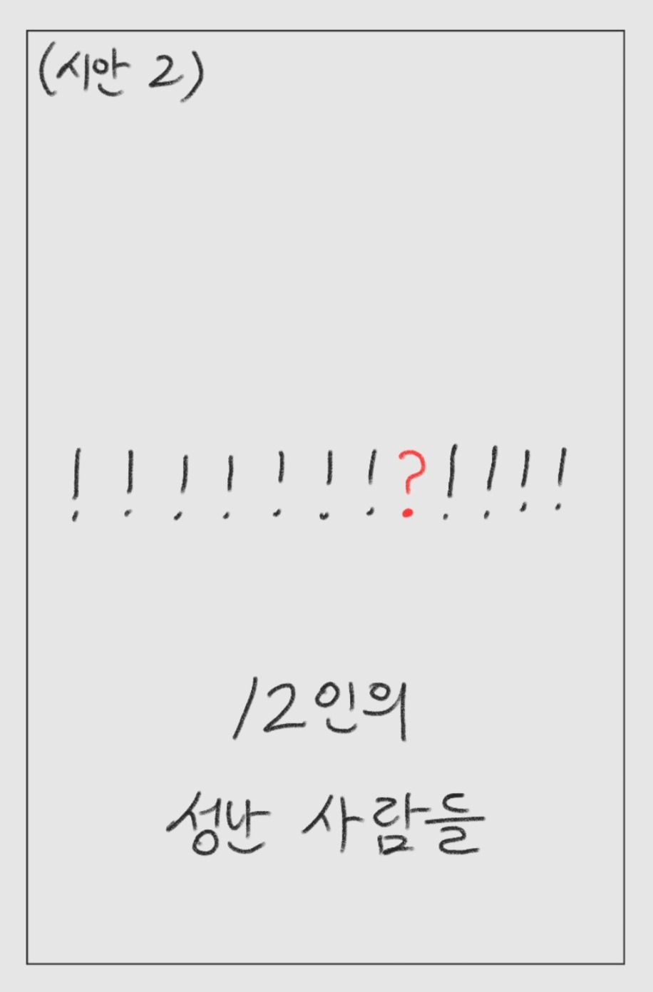 이왕 포스터를 만드는 김에 제대로 만들고 싶었다. 설레는 마음으로 <12인의 성난 사람들> 포스터를 인터넷에 검색해 보았다. 워낙 자주 공연화됐던 극이다 보니 검색을 조금만 해 보면 여러 디자인이 나왔고, 그 디자인을 그대로 따라 하는 건 독창성이 결여된 인간 같았다. 그리고 첫 연극의 포스터를 만드는 건데 나름 공을 들여야지! 하는 마음으로, 시중에 나와 있는 포스터의 특징을 살펴본 결과 공통점이 있었다. 유일하게 아버지를 칼로 찌르고 달아난 것으로 의심되는 소년을 12인의 배심원 중 유일하게 '무죄'라 주장하는 8번 배심원을 포스터에 의미심장하게 표현한다는 것이었다. 다 같이 계단을 올라가는데 8번만 뒤돌아보고 있다거나, 12개의 의자 중 하나만 빨간색이거나, '유죄' 글씨를 죽 나열하고 '무죄'를 빨간색 글씨로 딱 하나 집어넣는다거나 하는 식이었다. 그렇다면 이런 디자인과 겹치지 않으면서, 8번 배심원이 '무죄'를 주장한다는 점을 포스터에 표현하는 게 포인트였다.