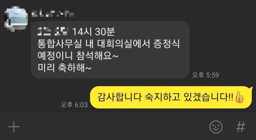일이 커졌다. 바이저님께서 대회의실에서 하는 증정식에참석하라고 하셨다. "미리 축하해~" 라니. 무엇을 축하해 주시는 걸까? 이미 칭찬 VOG 보상으로 세븐일레븐 쿠폰 받아서 따뜻한 아메리카노와 버터 쿠키를 야무지게 해치웠는데 또 받을 것이 있단 말인가? 뭔진 모르겠지만 "감사합니다 숙지하고 있겠습니다!!" 답해드리고는 행사 날짜를 기다렸다.