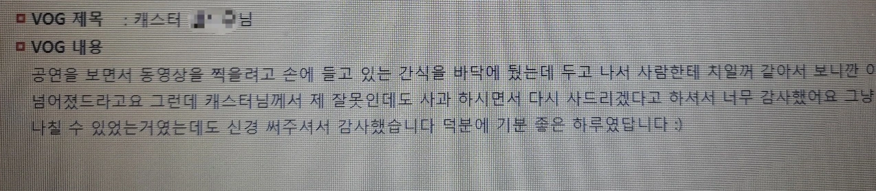 동료 캐스트 K가 흙 범벅 프레첼의 주인인 손님이 내게 쓴 칭찬 VOG를 캡처해 단톡방에 공유한 것. 프레첼을 못 먹게 하고 심지어 변상해드리지도 못했는데, 이런 공개 칭찬 VOG를 받으니 얼떨떨했고, 칭찬을 받는 게 맞는지 혼란스러웠다. 칭찬 VOG의 보상으로 받은 세븐일레븐 3000원 쿠폰을 쓰면서도 이 쿠폰의 쓰임이 정당한지 알쏭달쏭했다. 칭찬 VOG를 받는다고 해서 캐스트의 등급이 올라가는 건 아니어서, 뭐 기분 좋은 일이네~ 이런 것까지 써 주시다니 감사하네~ 칭찬 VOG를 받았던 적이 있었지~하고 미래에 오늘을 회상할 정도로만 여겼다.