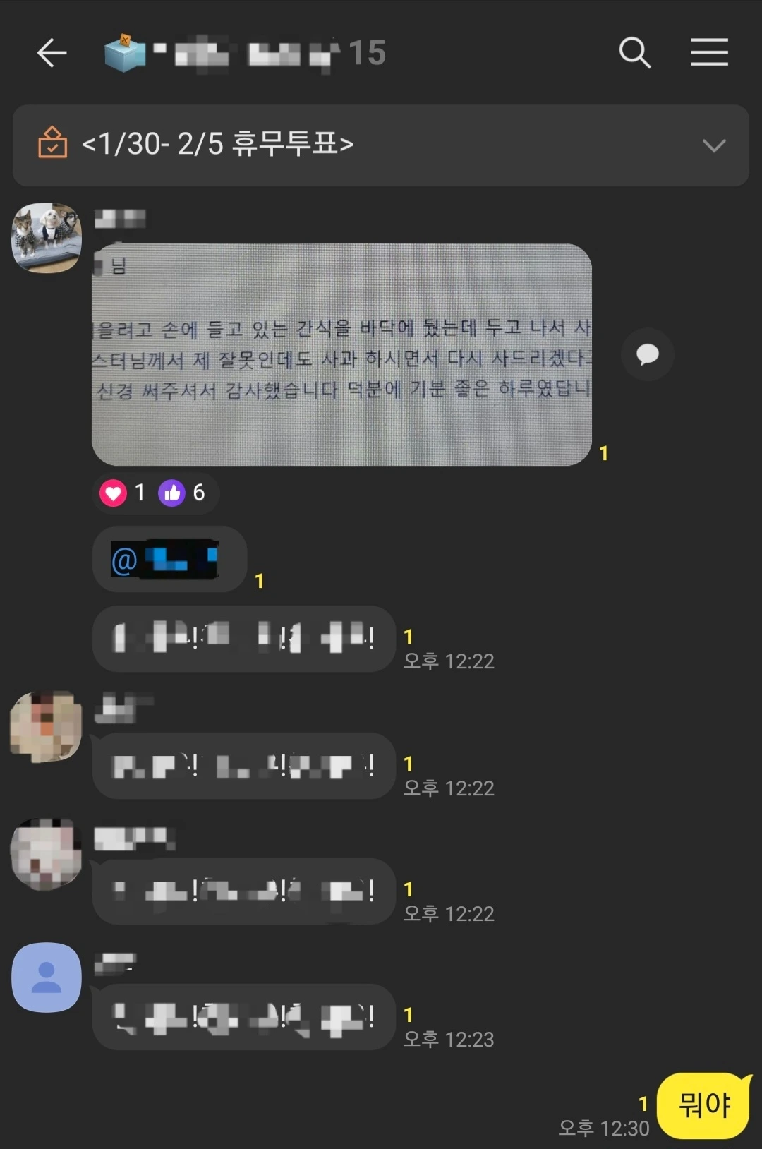 일주일 정도 후. 카카오톡 알림이 시끄럽게 울렸다. 안전청결 업무 공유 단톡방에 서너 명의 캐스트가 내 이름을 연속으로 호명하고 있었다.