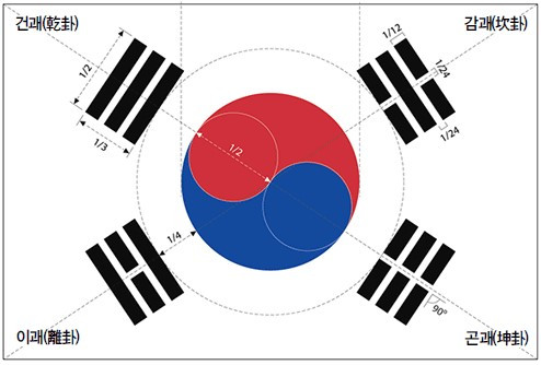네 모서리의 사괘는 음과 양이 서로 변화하고 발전하는 모습을 효(爻 : 음 --, 양 ―)의 조합을 통해 구체적으로 나타낸 것이다. 그 가운데 건괘(乾卦)는 우주 만물 중에서 하늘을, 곤괘(坤卦)는 땅을, 감괘(坎卦)는 물을, 이괘(離卦)는 불을 상징한다. 이들 사괘는 태극을 중심으로 통일의 조화를 이루고 있다.」라고 설명한다.