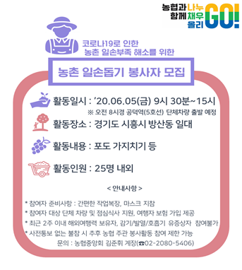 코로나 19로 외국인 노동자들이 떠나자 농촌은 노동력 부족사태를 겪고 있다. 농번기가 시작되며 일손이 더욱 부족해지자 자원봉사자를 구하고 있는 상황이다.