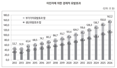 많은 사람들은 외국인 노동자들의 임금이 본국으로 보내지기 때문에 국부 유출의 부정적인 영향을 준다고 생각한다. 하지만 이는 좁은 시각에서 바라본 것이다. 거시적으로 보면 외국인 노동자의 유입은 오히려 한국 경제에 긍정적 영향을 끼친다. 한국경제연구원이 발간한 ‘이민확대의 필요성과 경제적 효과’에 따르면 생산가능인구의 감소와 빠른 고령화를 겪는 한국경제는 외국인 노동자를 통해 성장할 수 있음을 보여준다. 외국인 근로자는 생산자임과 동시에 소비자이기 때문에 노동력 부족 문제를 해결함과 동시에 재화와 서비스를 소비하므로 경제의 활성화를 가져온다. 아래의 그래프를 보면 외국인 근로자의 생산으로 생산유발효과와 부가가치유발효과가 꾸준히 늘어남을 알 수 있다.
