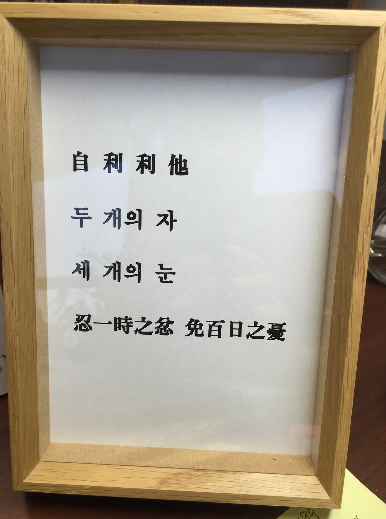 그 후 “두 개의 자, 세 개의 눈”이 적힌 작은 액자를 몇 년째 책상 위에 올려 두었다. 지금은 그 문구가 “매일이 소풍이다”로 바뀌었지만.