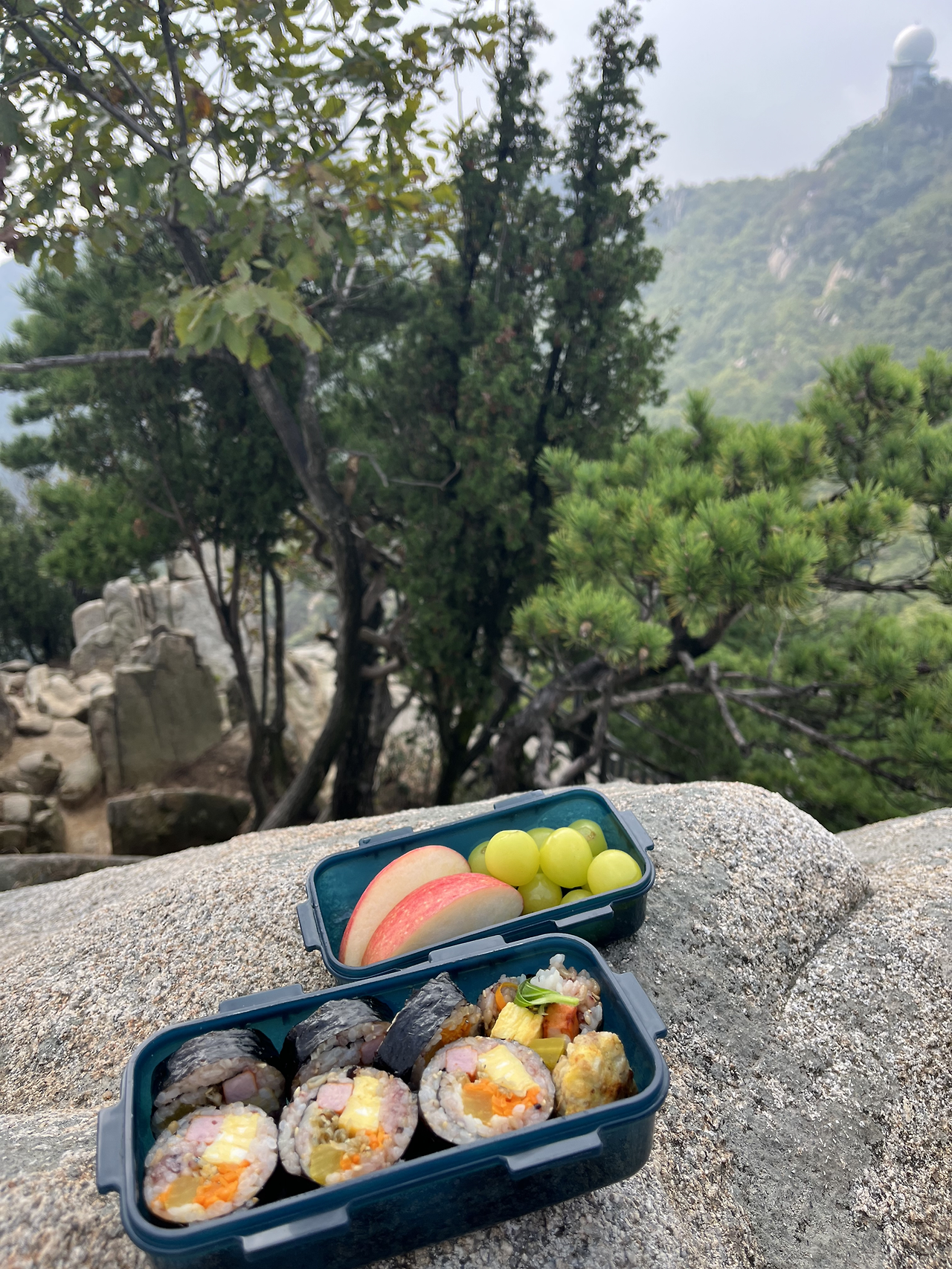 관악문을 지나면 뾰족한 삼각형처럼 생긴 산봉우리의 옆구리를 가로지르고 그다음 가파른 봉우리를 오르면 연주대 절벽이 눈앞을 가로막는다. 클라이맥스를 앞두고 오른쪽으로는 서울시내와 왼쪽으로는 과천 대공원이 뿌옇게 내려다 보이는 바위 위에 앉아 도시락을 풀었다. 아들이 초등학교 때 가지고 다니던 도시락이라 양이 작지 않을까 생각했는데 김밥과 과일을 먹고 나니 배는 그득하고 몸은 묵직, 쌕은 가볍다.