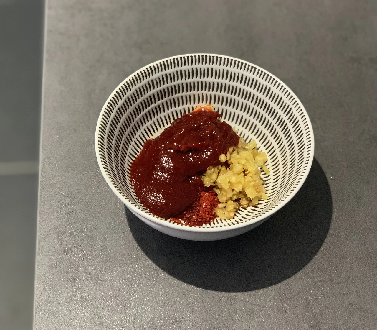 2. 육수가 끓을 동안, 양념장을 준비해준다. (꿀키님의 유튜브를 보고 참고했다.) 고추장 1큰술, 고춧가루 2큰술, 간장 1큰술, 다진 마늘 1큰술(꿀키님은 1/2만 넣었지만, 난 마늘을 좋아하기에 1큰술 넣었다.) 마지막으로 육수 한 스푼을 넣어주고 섞는다.
