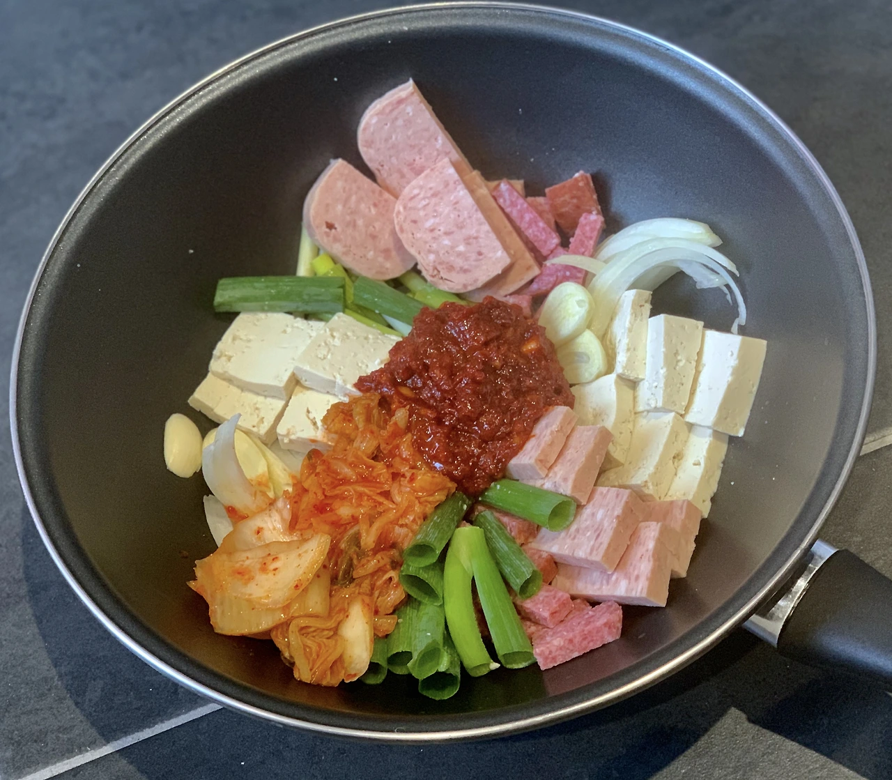3. 스팸 1/4조각, 두부 1/3모, 살라미 조금, 김치, 대파, 양파 1/2개를 준비해서 잘 넣어준다. (재료는 냉장고 사정에 따라 넣어주면 된다. 다만, 우리 집 부대찌개의 핵심은 살라미에 있다. 살라미를 넣어야 밖에서 사 먹는 부대찌개 특유의 맛이 나는 것 같다.)