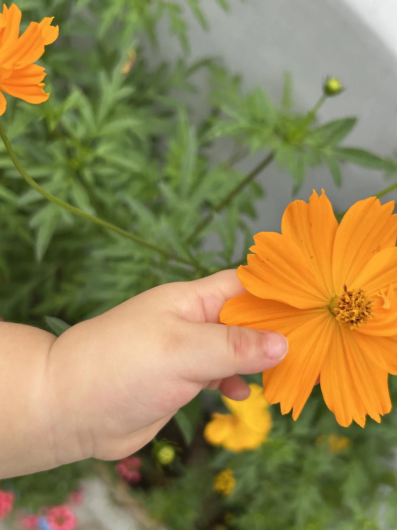 (집 앞 화단에 핀 꽃 한 송이에도 즐거워하는 해솔이. 통통한 손으로 꽃잎을 만지는 모양이 너무 귀엽다.)