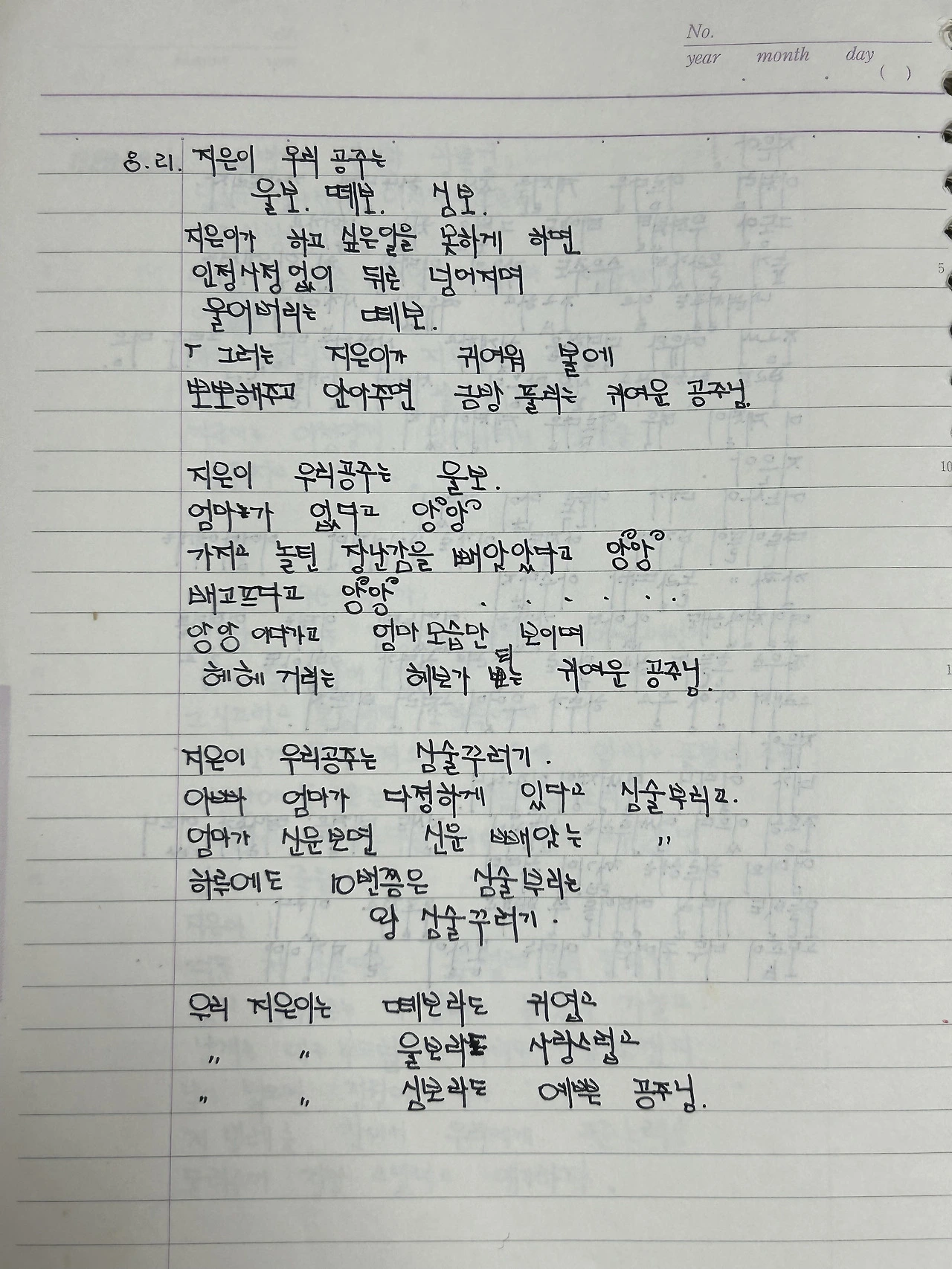 친정엄마가 분명 아기 지은이는 이렇지 않았다며, 해솔이는 누구를 닮아 이렇게 울보에 떼보냐고 했는데 엄마의 기억이 미화가 되었나 보다. 친정 엄마의 육아일기에 적힌 '떼보 지은이'라는 선명한 글자. 떼보 해솔이는 엄마를 닮은 것이 분명하다. 아기 지은이는 떼보였는데, 그런 떼보 지은이 마저 사랑스럽게 기억하는 엄마의 사랑이 기억의 왜곡을 만들어냈나 보다.