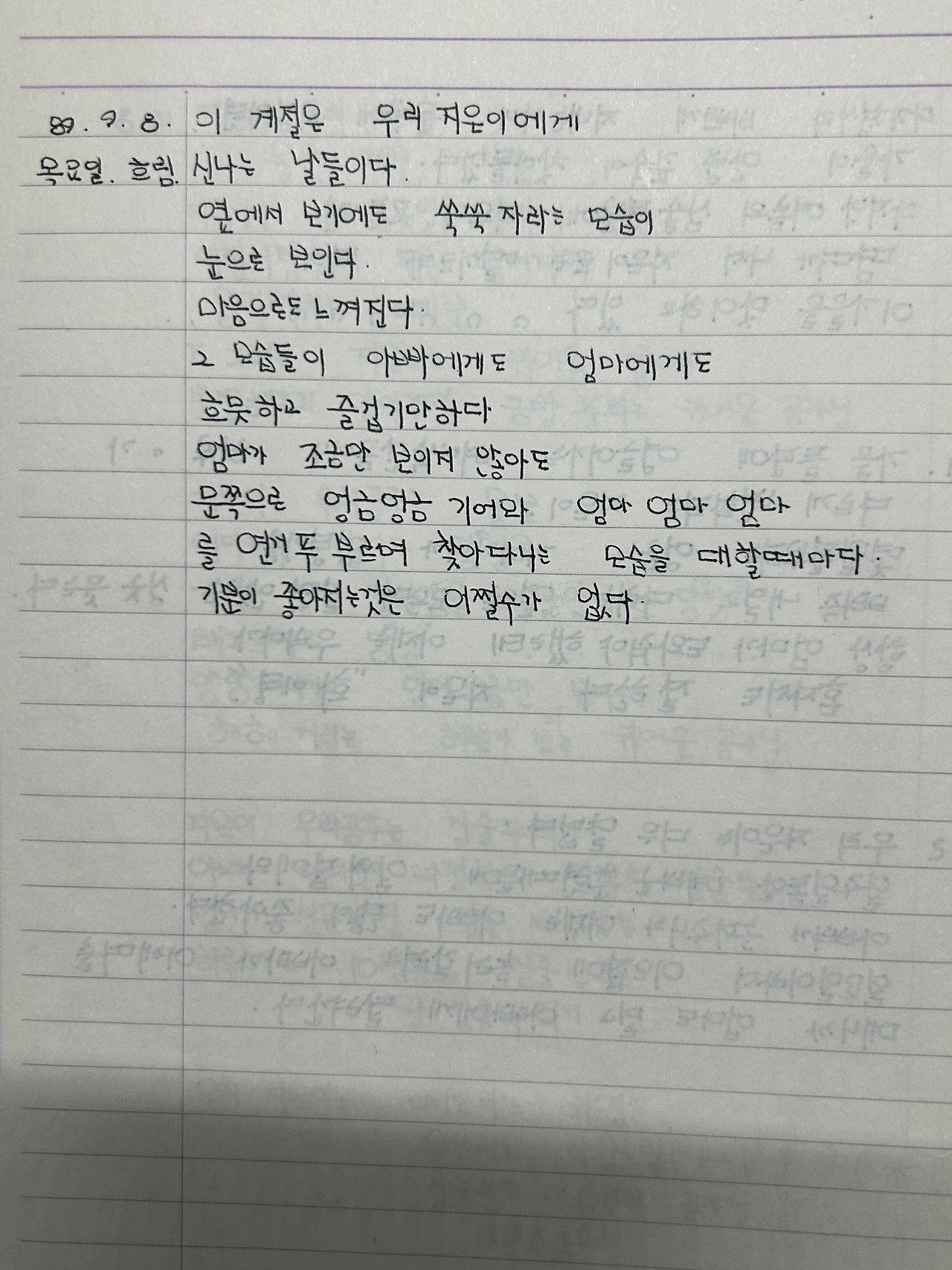 이렇게 엄마와 매일 얼굴을 마주하며 식사를 하고 같이 시간을 보낼 수 있어 참 감사해. 우리 이솔,해솔이가 없었으면 모르고 지나갔을 시간들. 결혼하고서도 엄마와 이렇게 함께 시간을 보내는 게 나에게는 보너스 같은 시간이야. 물론 아이들을 돌보는 게 쉽지 않은 일이라 엄마에게 항상 미안한 마음이지만 그래도 우리 아이들을 연결고리 삼아 같이 공유할 수 있는 무언가가 생겨 참 좋아. 올해는 특히 엄마의 육아일기에 나의 일기를 이어 쓰고 있어 그런지 시공간을 뛰어넘어 서로 소통하고 있는 느낌이 들어.