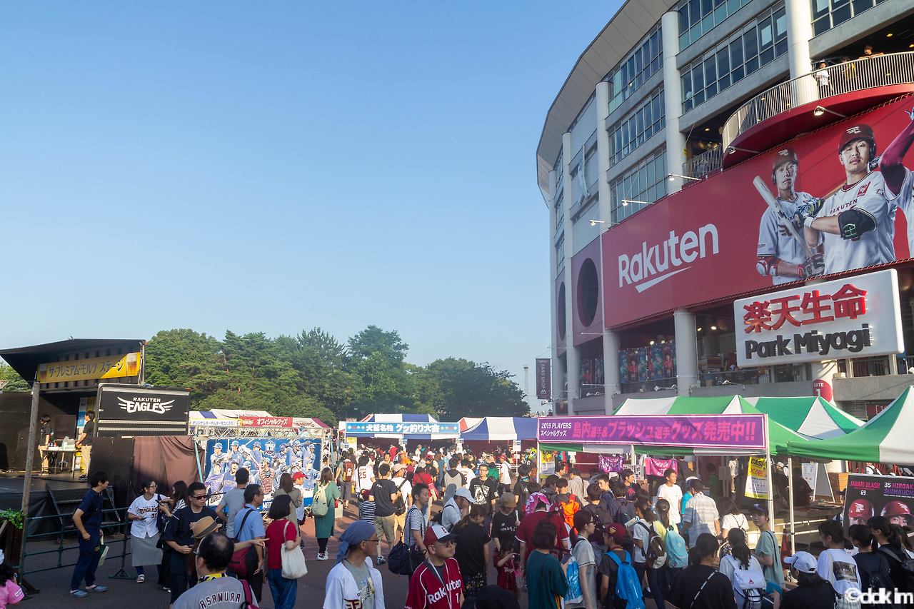 야구장 주변을 둘러본 뒤 게이트 주변 푸드트럭에서 타코야키를 사들고 자리를 찾아 입장했다. 티켓에 쓰인 게이트로 입장하면 바로 자리를 찾을 수 있는 구조였다. 나는 내야의 지정석을 골랐는데, 티켓을 구매할 때 40여 가지의 좌석 종류가 있어서 라쿠텐 구단의 자생을 위한 노력을 새삼 느낄 수 있었다. 자리를 찾아서 들어가 보니 꾸준한 리모델링에도 불구하고 세월의 흔적이 느껴지는 부분이 있었다. 좌석 간의 간격이 좁고, 경사진 내야석은 답답한 느낌을 주었다. 반면에 외야에는 미야기 생명 파크의 랜드마크인 관람차를 필두로 놀이공원과 신설 좌석 등이 설치되어 있어서 현대적인 느낌을 주었다. 또 야구장의 거의 모든 공간을 최대한 활용하려는 모습도 돋보였다. 더그아웃 바로 옆까지 빼곡하게 들어찬 좌석들은 라쿠텐의 방향성을 드러내고 있었다. 그리고 국내의 많은 야구 구단들이 벤치마킹한 내야의 테이블석도 상당한 비중을 차지하고 있었다.