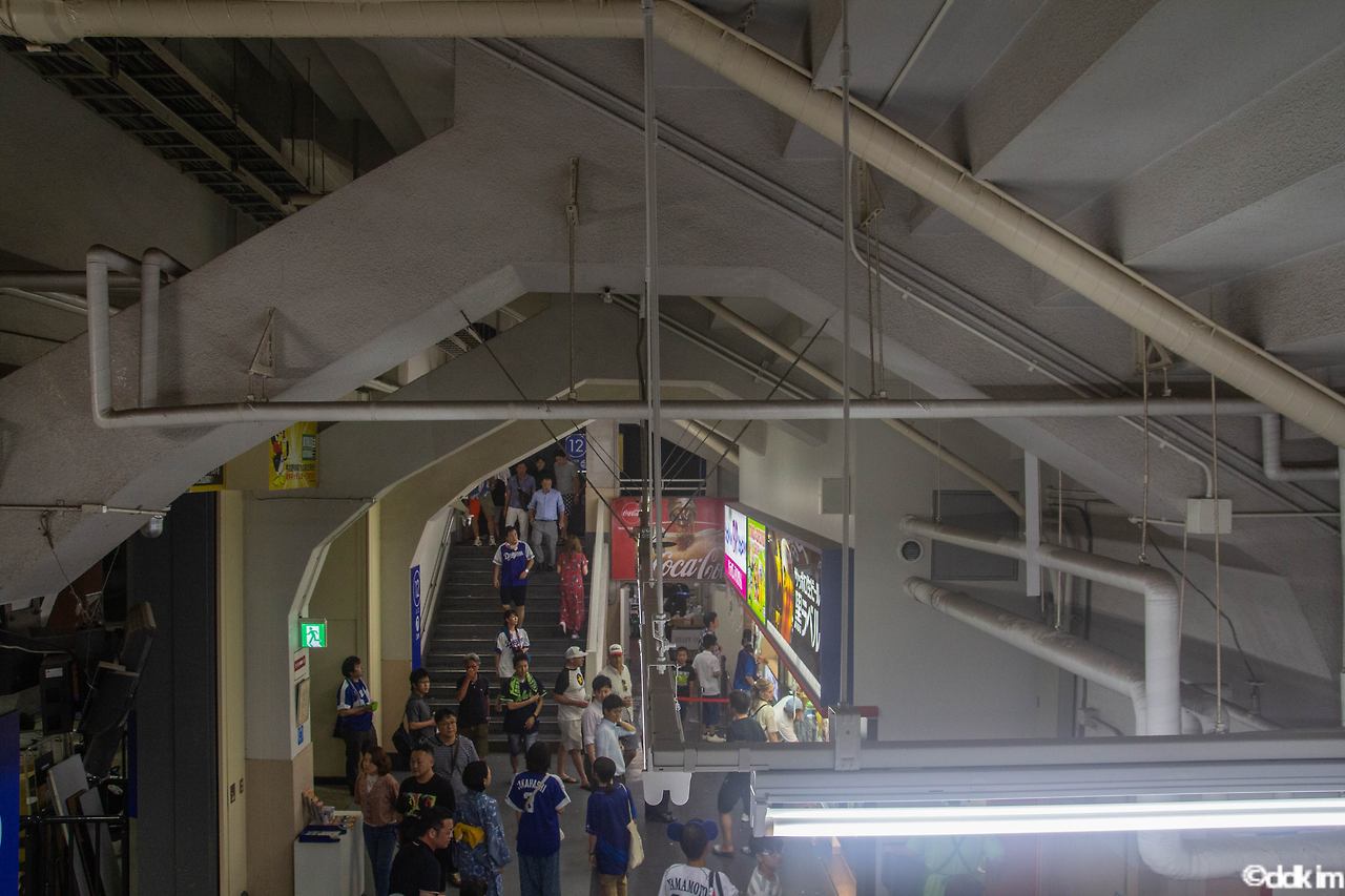 야구장 주변을 둘러보다 보니 어느덧 입장할 시간이 되었고, 나는 티켓에 적힌 게이트를 찾아 줄을 섰다. 야구장에 입장하는 게이트는 굉장히 많았고, 각 게이트마다 줄을 세우는 직원과 티켓과 가방을 검사하는 직원 등 많은 인력이 필요해 보였다. 특히 게이트가 많고, 야구장 주변의 공간이 협소하다 보니 게이트 별로 줄을 세우는 직원들의 역할이 중요해 보였다. 다만 게이트로 입장하고 나서는 자리를 바로 찾아갈 수 있었다. 야구장에 들어가 보니 첫인상은 온통 파란색이어서 시원한 느낌이 들었다. 야쿠르트를 대표하는 컬러는 블루라고 하는데 야구장이 그러한 콘셉트에 의해서 잘 꾸며진 느낌이었다. 다만 문제는 상대팀인 주니치의 유니폼 컬러가 블루 계열이어서 오히려 홈팀 같은 느낌을 주었다는 것이다. 야쿠르트는 치타 무늬와 같은 난해한 유니폼을 입었는데, 조금 이해하기 어려웠다.