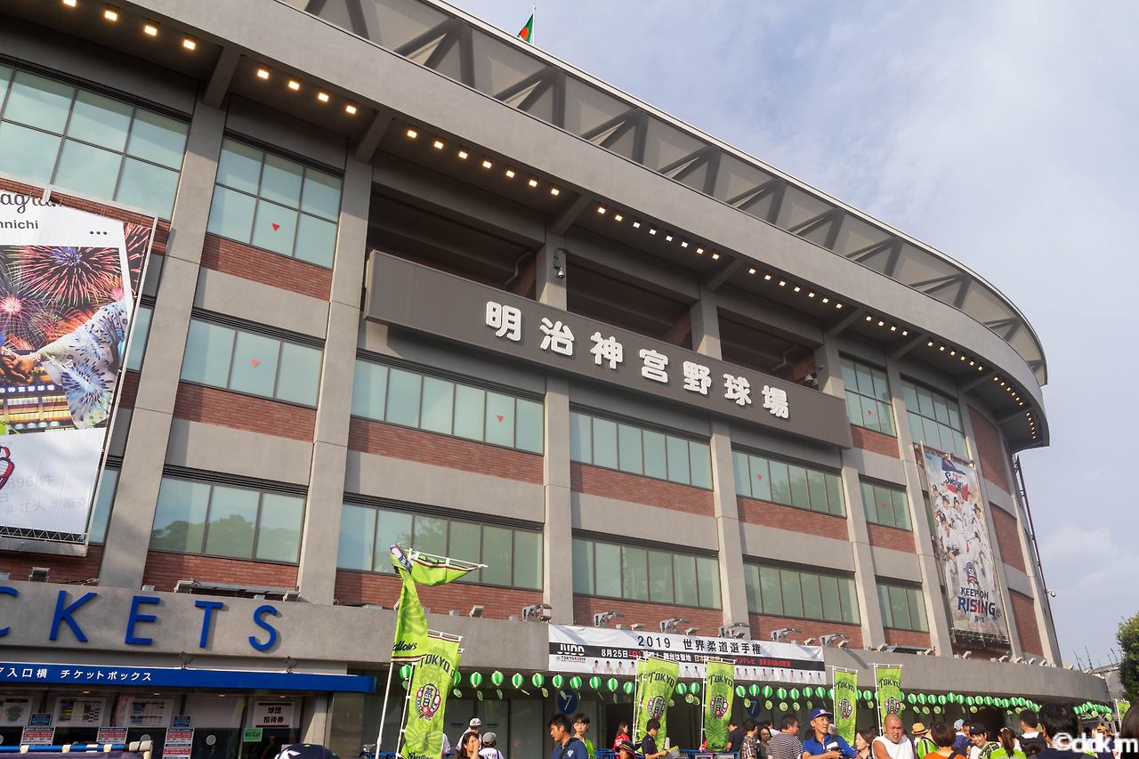 메이지 진구 야구장은 1926년 개장한 100년 가까이 된 야구장이다. 현재는 야쿠르트 스왈로즈의 홈구장으로 쓰이고 있으며 프로야구 경기보다도 대학야구의 성지로 유명하다. 실제로 내가 방문했던 2019년 8월 16일에도 스왈로즈의 경기 전에 대학 야구 경기가 진행되고 있어서 선수들이 야구장 밖에 보조 구장에서 몸을 풀고, 경기전 연습을 진행했다. 메이지 진구 야구장은 과거 한국에 존재했던 동대문 야구장을 떠오르게 했다. 나는 지하철을 타고 아오야마 잇초메 역에서 내려 약 10분 정도 걸은 후 야구장에 도착할 수 있었다.