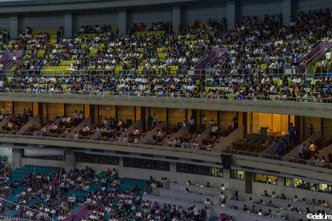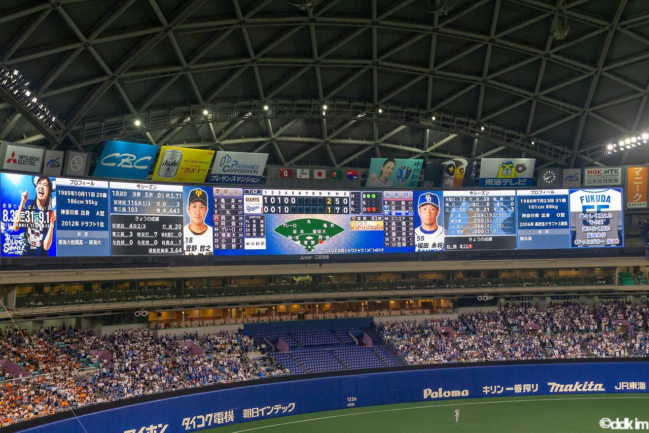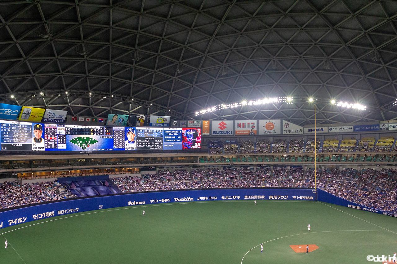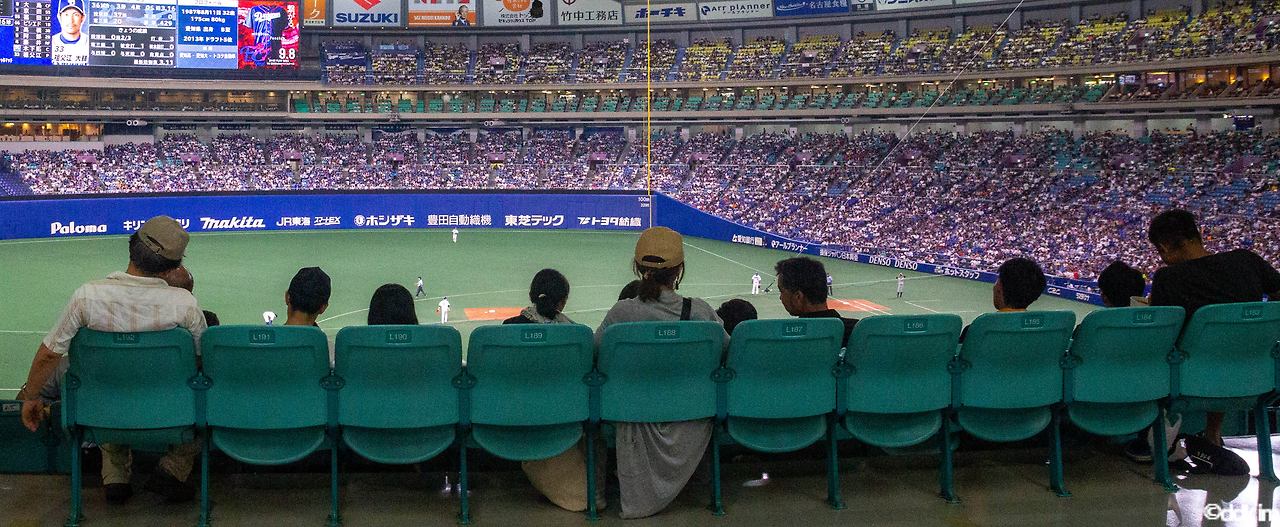 나고야 돔은 주니치의 컬러 아이덴티티에 맞게 꾸며져 있었다. 짙은 청색과 녹색이 어우러져서 깔끔하게 정돈된 야구장의 분위기는 차분했다. 또 야구장 곳곳에 위치한 광고판들도 정확한 규격으로 설치되어 있어서 정돈된 느낌을 주었다. 중간층에는 스카이박스가 야구장을 둘러싸고 빼곡히 들어서 있었다. 내야에는 익사이팅 존처럼 더그아웃 옆에 붙어있는 좌석이 있는데, 푹신한 의자가 그곳이 프리미엄 좌석임을 드러내고 있었다. 야구장 내부를 알차게 쓰고 있다는 느낌이 들었다. 내부는 살짝 한기가 느껴질 정도로 시원해서 무더운 날씨에도 불구하고 매우 쾌적했다.