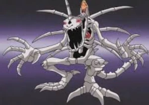 그런데 지금도 기억나는 정말 충격적인 장면이 있습니다. 저 뿐만 아니라 많은 어린 시청자들이 당시 꽤나 무서웠다고 평가하는 장면입니다. 바로 아구몬이 뼈다귀 괴물이 되는 장면이죠. 정확하게 기억나진 않지만 아구몬이 당시 진화를 못하는 상황이었는데, 아구몬 집사였던 태일이가 진화하라고 온갖 짓을 다 합니다. 힘을 내야 한답시고 배가 터질 것 같은데 계속 음식을 먹이는 식고문을 행하고, 빨리 진화하라고 갈구고 정말 아구몬을 못살게 굴던 상황이었죠. 결국 어찌찌 진화시키기는 했는데, 제대로 될 턱이 있나요. 결국 아래와 같이 상상치도 못한 뼈다귀 괴물로 변해버리고 맙니다. 저도 진짜 뼈다귀 괴물이라고 말하고 다니다가 이름을 검색해 봐서 기억했는데 스컬그레이몬이었죠.