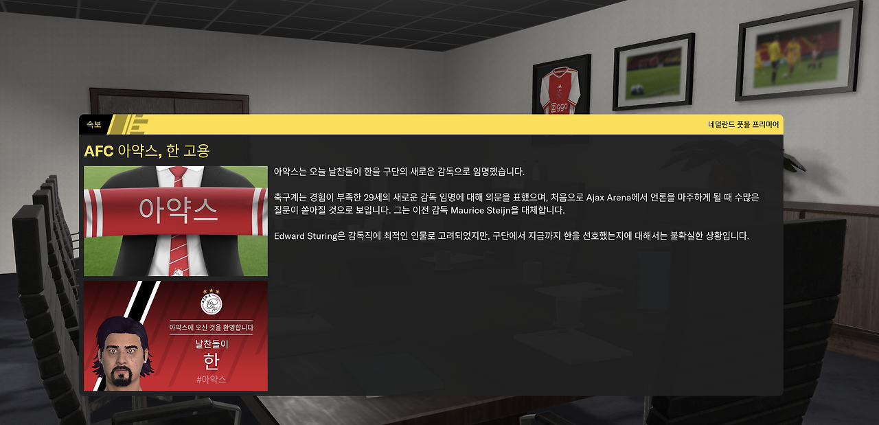 그리고 또 한 명의 감독이 추가될 수 있을까? 바로 날찬돌이 감독이다. 이 감독은 명가 아약스를 다시 챔스에 우승시키기 위해 이곳에 왔다. 과연 날찬돌이 감독은 아약스를 챔스에서 우승시키는 감독이 될 수 있을까? 꾸밈없는 솔직한 FM24 이야기 기대해 주세요!