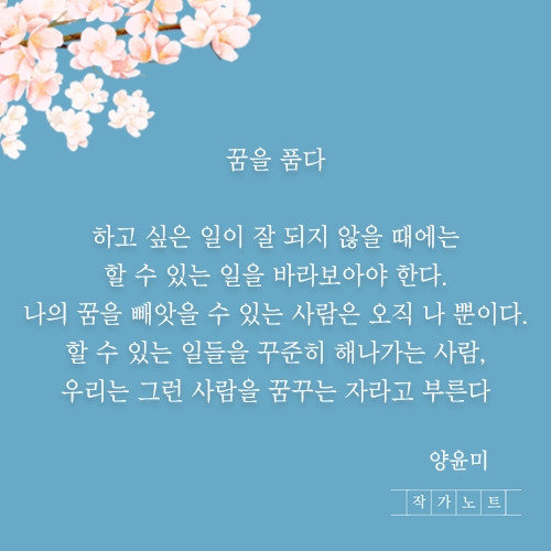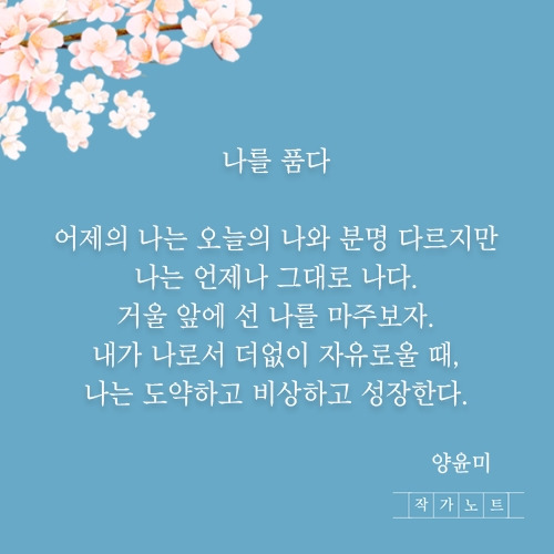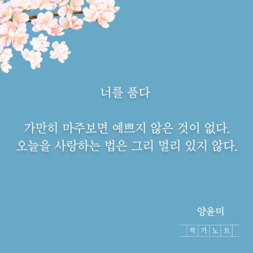 일상을 예술로 바라보고 예술같은 삶을 사는 일은 어쩌면 정말 쉬운 일일지도 모른다. 무심히 지나쳐버릴 지금 이 순간, 가만히 멈춰서서 마주볼 용기를 내보시길. 우리의 오늘을 사랑하고 지금이순간의 나와 너를 품는 작품 전시회는 5월 4일까지 이어진다. 3가지의 세부 주제 "꿈을 품다, 나를 품다, 너를 품다"로 나뉘어진 작품들의 해설을 돕기 위해 작가노트도 비치해 두었다.