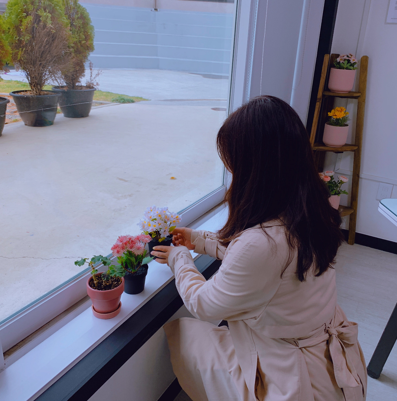 전시회 첫 날, 은은한 피아노곡을 세팅해두고 혹시 미흡한 부분은 없는지 둘러본 후 점심을 먹으러 나왔다. 이 정도면 이제 정말 준비가 다 끝났겠지 하는 마음으로 뿌듯해 하던 때에 때마침 까만색 승용차가 주차장으로 들어섰다. 그런데 꽃다발을 들고 내리신 처음보는 여성분께서 갑자기 양윤미 작가님을 찾는것이 아닌가. 전시 첫날에 맞춰 포천에 계시는 진샤작가님이 응원차 보내신 꽃다발이었다. 세상에. 말잇못이었다. 며칠 후에는 천사같은 글향 작가님도 바쁘신 와중에 먼길을 달려 전시를 응원하러 와주셨다. 작가님을 닮은 예쁜 꽃과 함께. 나는 또 말잇못이었다.