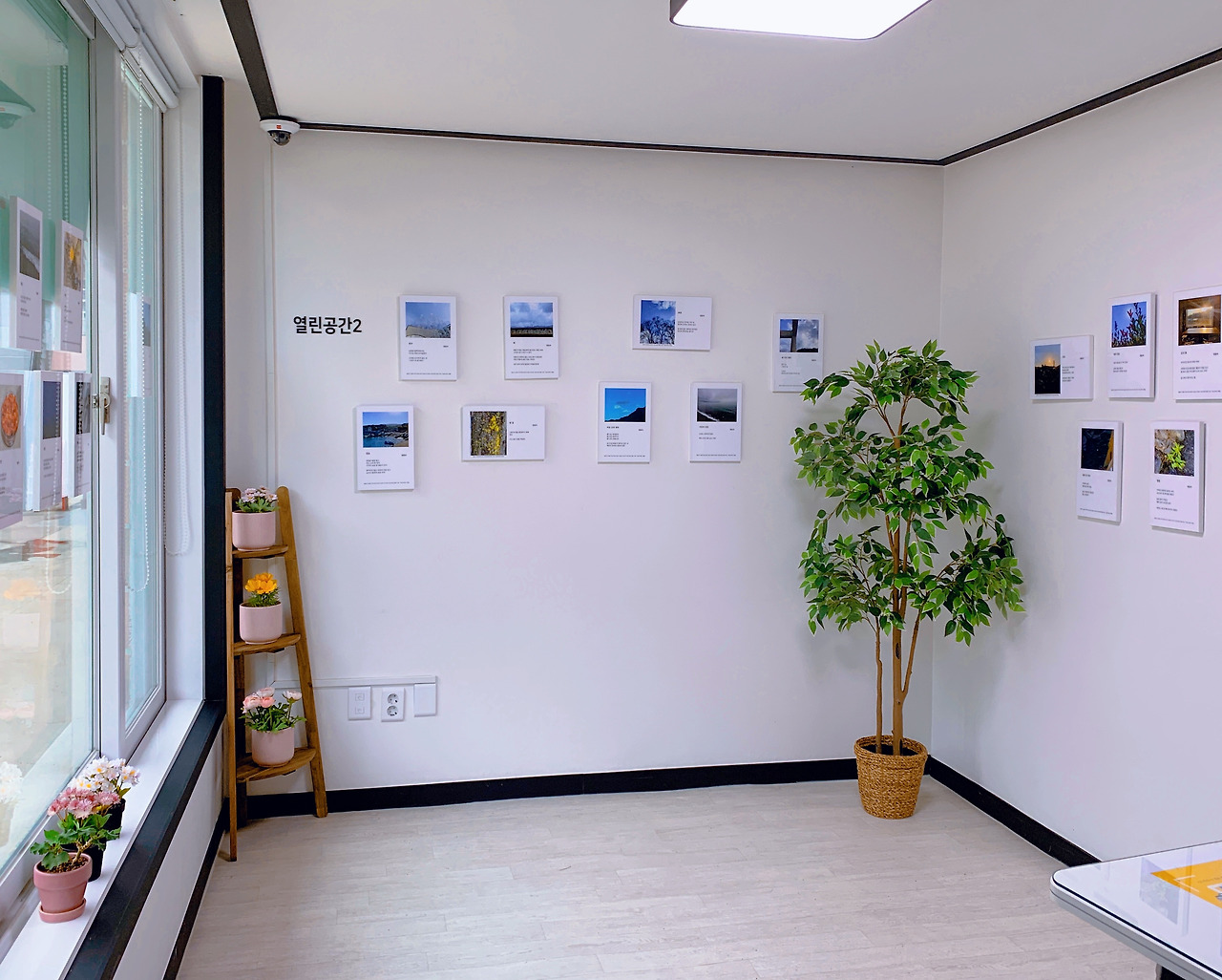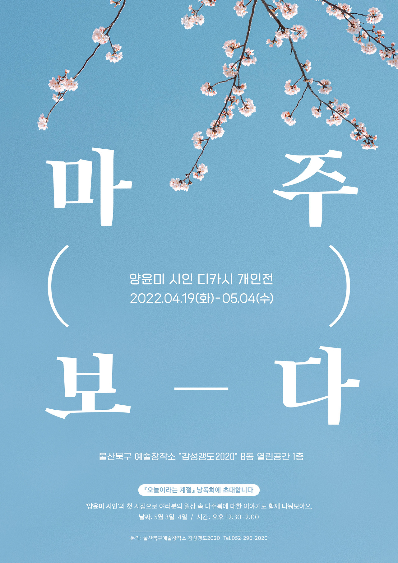그렇게 4월 19일 화요일, 양윤미 시인의 1st 디카시 개인전시회가 시작되었다. "감성갱도2020"이라는 갤러리가 외진 곳에 있어서 많은 분들이 보진 못할 것이라 생각했는데, 직원분들 말씀으로는 지나다니는 주민들이 종종 들어와서 읽어보신다고 했다. 1층 유리창에 붙은 시트지와 활짝 열린 문 앞에 붙어있는 예쁜 포스터가 눈길을 끌었던 걸까. 어쨋든 많은 분들이 일상 속에서 잠시 멈춰 서서 예술을 마주보면 좋겠다는 기획의도대로 되고 있었다.