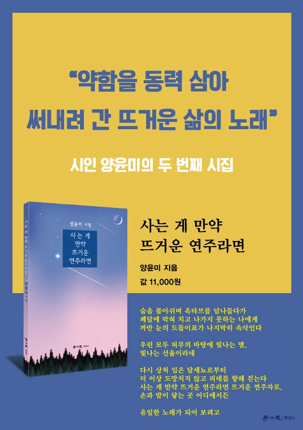 2023 울산문화관광재단 청년예술 지원사업공모에 선정된 작품집이라 더욱 뜻깊다. 두 번째 시집의 표제작을 뽑아주신 편집자님께도 감사하다. “사는 게 만약 뜨거운 연주라면”의 제목만으로도 가슴에 와닿는 무언가가 있었다고 해주신 응원의 말씀을 오래도록 기억할 것 같다. 용기 내어 펼쳐낸, 삶이 담긴 시집이 세상에서 “환대” 받기를, 독자분들에게 문학과의 즐겁고 의미 있는 만남이 되기를 바란다.