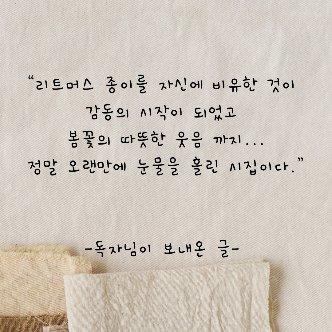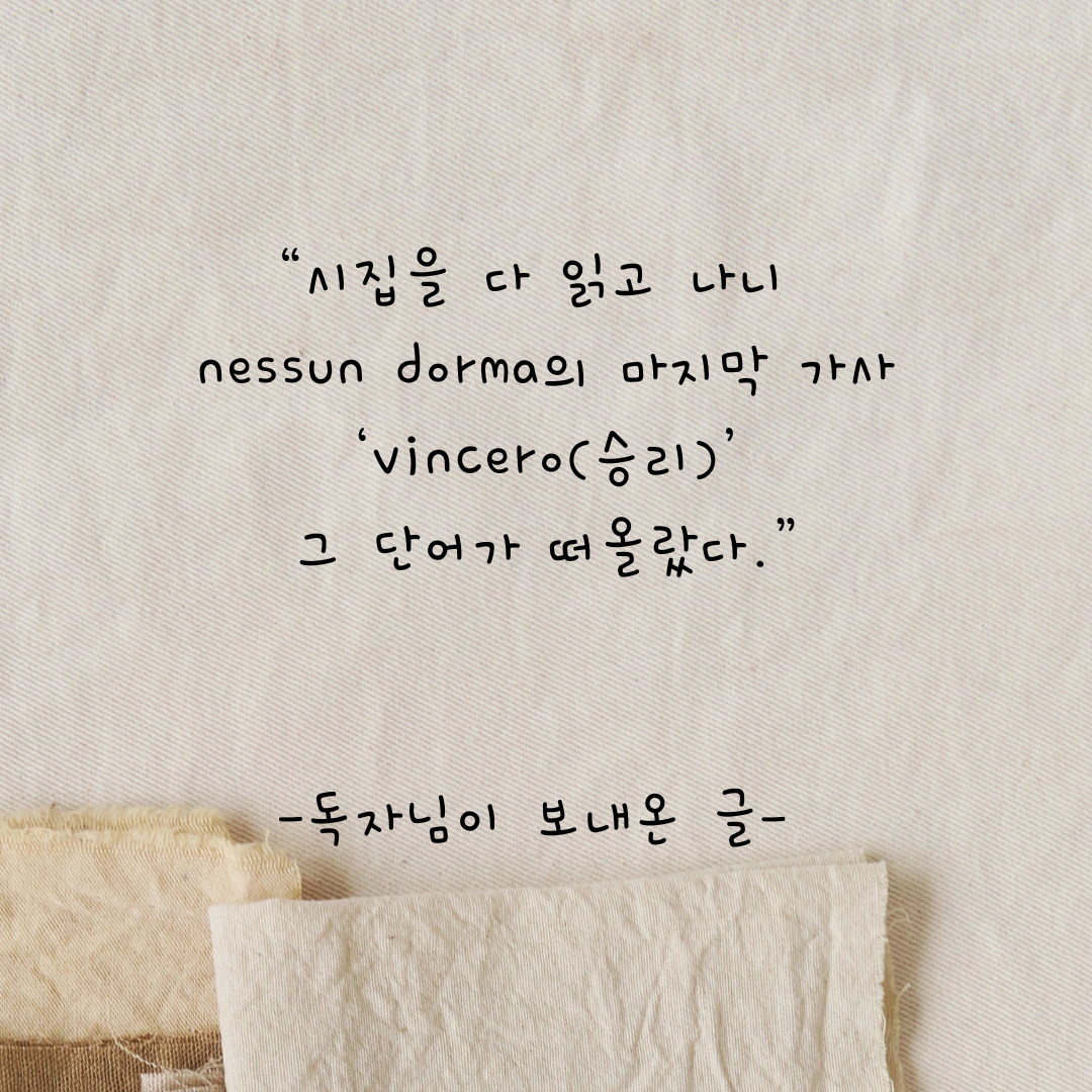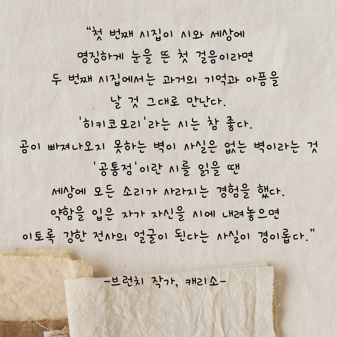 요즘은 신간 시집을 받아보시고 읽어보신 분들의 짧은 메모와 감상을 염탐하면서 하루 일과를 시작한다. 오늘은 “캐리소” 작가님께서 올려주신 시집 리뷰를 보며 아침 댓바람부터 울어버린 것은 안비밀이다. 인스타에서 나를 검색하여, 디엠을 보내주시는 독자분도 있다. 출간 소식에 먼저 연락주시고, 진심으로 축하해주시며 축복해주시는 작가님들이 있어 기쁘다. 좋은 것들을 크게 보고 있자니, 감동이 더해지는 날들이다.