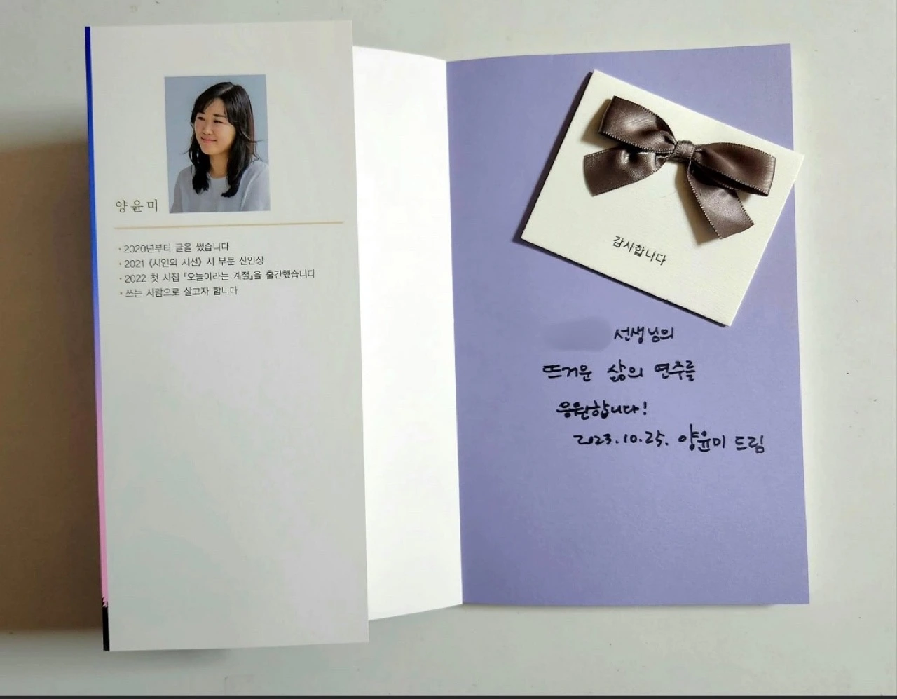 한 땀 한 땀 시어를 골라 구슬을 꿰듯 정성들여 완성한 자식같은 시집을 잘 읽어달라는 마음을, 그 분들은 굳이 말하지 않아도 헤아리실 것이 분명했다. 그러나, 그럼에도 불구하고, 사실상 나와 아무런 교집합이 없는 그 분들 입장에서는 아마도 내가 난생 처음보는 인물일 게 뻔하지 않은가? 그래서 굳이 애써서, 간단한 자기 소개와 인사말을 담아 일일이 손편지를 적었다. 받는 분의 성함도 꾹꾹 놀러적어가며 말이다.
