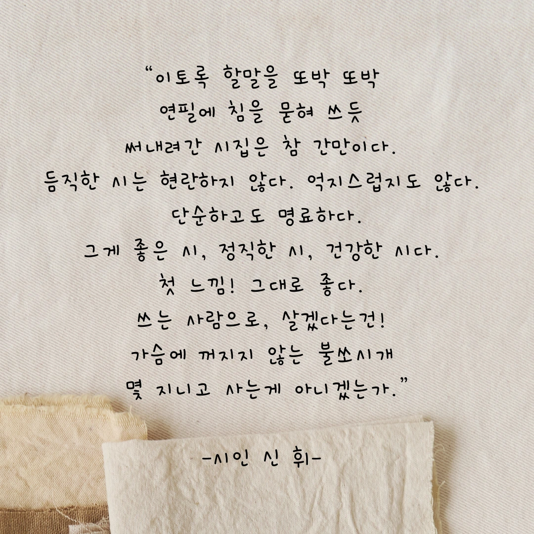 글쎄, 처음보는 시인이 손편지와 함께 시집을 보냈다고 해서 나와 내 시집에 대한 평가가 크게 달라지진 않을 것이다. 그러나 조금이라도 더 진정성있게 예의를 갖춰 보내고 싶었을 뿐이다. 많은 책 소포를 이미 넘치도록 받고 계실 분들에게, 친근한 인상을 남기고픈 마음이었으니까.