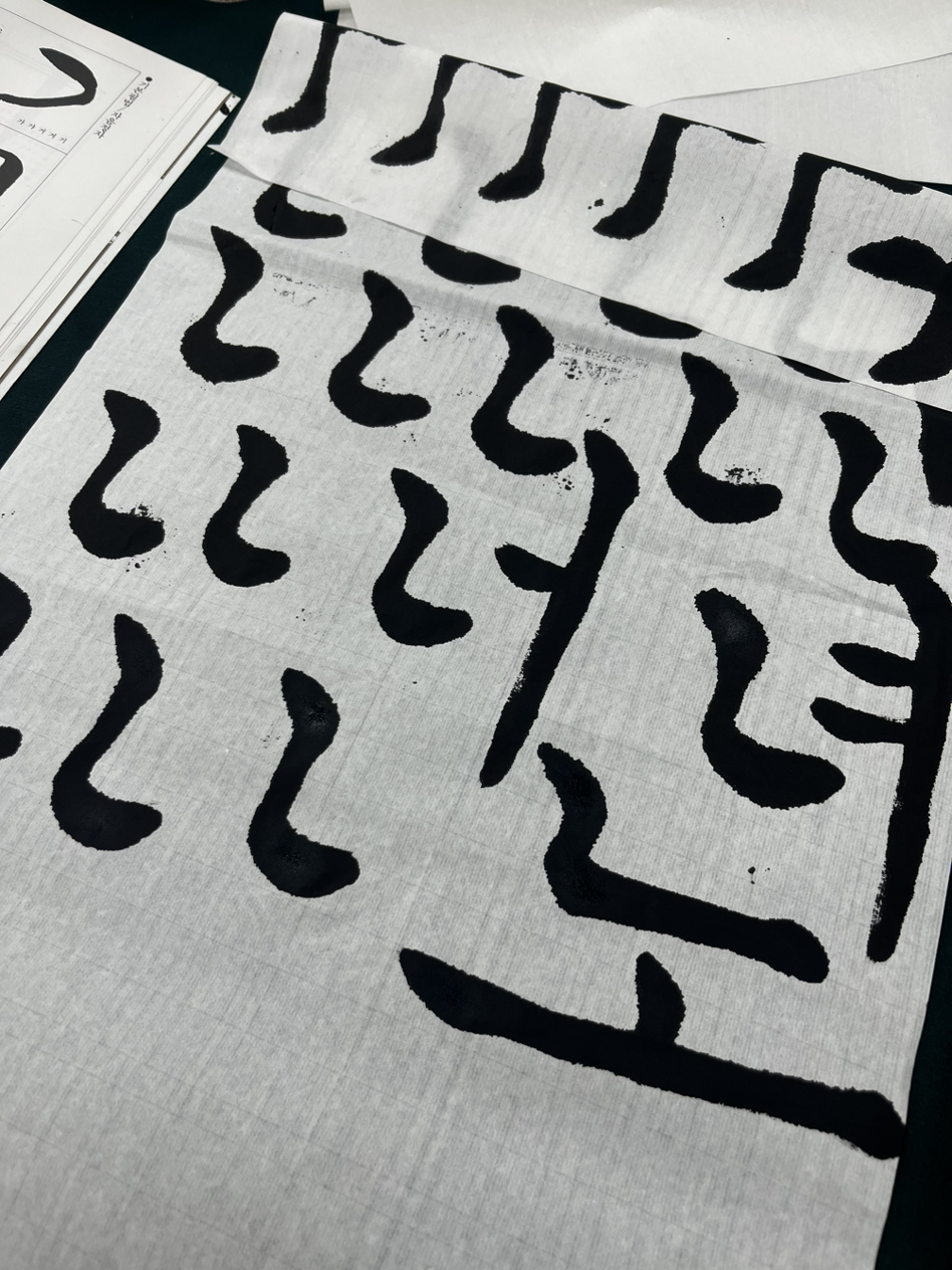 지루한 반복 훈련 끝에 드디어 ‘기역’을 쓰기 시작했다. ’ㄱ‘은 반달모양의 머리로 시작하여 붓끝을 엎어서 부드럽게 내려와야 하는데, 초보에게는 붓끝을 엎는 감각이 익숙할 리가 없었다. 기역을 죄다 악어입처럼 적고 있는 나에게 선생님이 다가와 다시 천천히 알려주셨다.