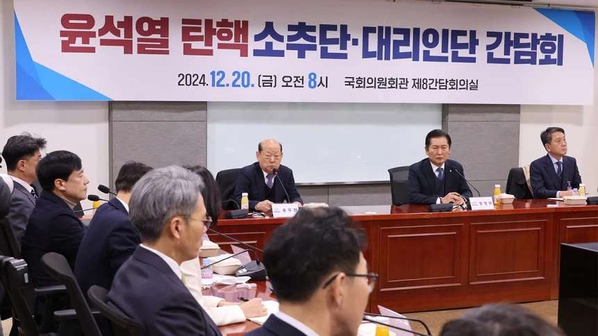 윤 대통령 탄핵심판 탄핵소추단과 대리인단은 20일 오전 8시 국회에서 간담회를 열었다. 탄핵소추단 2차 회의면서, 탄핵소추단과 대리인단이 함께 만난 첫번째 자리다. 정청래 위원장은 이날 모두발언에서 “우리는 윤석열 탄핵이라는 역사적 소임을 다하기 위해 오늘 하루 이 자리에 모였다. 이 또한 훗날 역사는 하나의 장면으로 기록하지 않을까 생각한다”고 밝혔다.