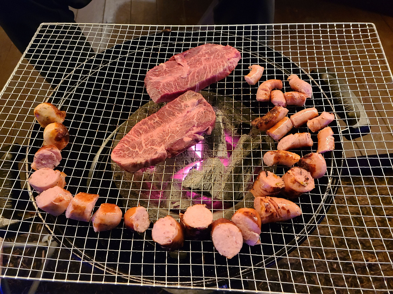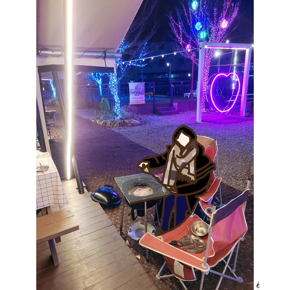 이번 힐링은 글램핑으로 결정했다. 사회적 거리두기가 더욱 강화되고 있는 추세였기에 인구 밀집 지역으로 떠나는 건 모두에게 위험할 것으로 판단했다. 그래서 어느 정도 거리 확보가 되는 야외 놀거리를 찾다보니 캠핑이 대두됐고, 가평에 괜찮은 글램핑장을 찾아냈다. 가만히 있으면 몸이 덜덜 떨리는 차가운 겨울 공기도 바비큐 불 앞에선 속수무책이었다. 루돌프처럼 빨갛게 익은 코끝이 숯불에 사르르 녹을 때쯤 고기도 서서히 익어갔다. 네온사인이 화려한 글램핑장에서 먹는 바비큐는 과연 일품이었다. 식탐 없는 내가 고기, 소시지, 라면을 그대로 흡입해버렸다. 분위기에 취한 건지, 와인에 취한 건지 잔뜩 상기되어 자정 너머까지 도란도란 이야기 꽃을 피웠다. 술만 마셨다 하면 잠드는 우리였기에 아무래도 장소 영향이 컸던 듯하다.