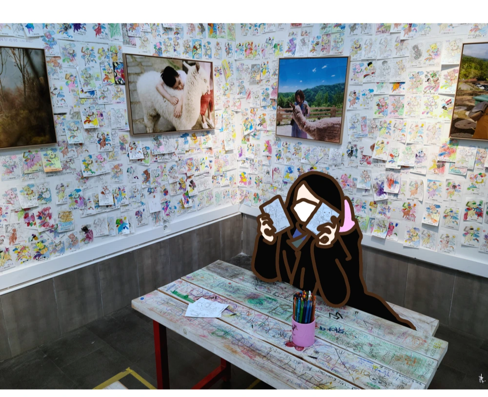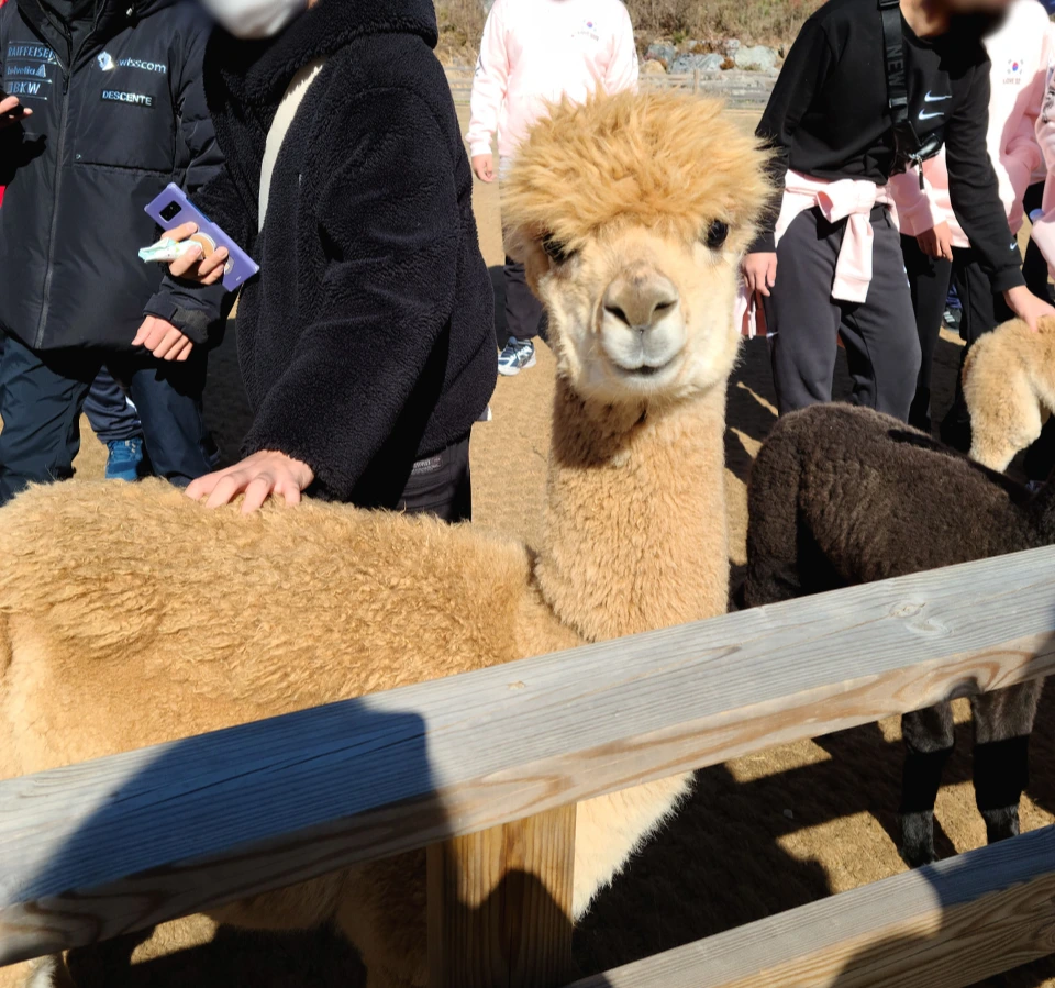 알파카 그림을 칠하는 공간이 있어 몸도 녹일 겸 들어가서 색칠을 했고, 추가금을 지불해 알파카 산책을 돕는 체험도 했다. 먹이를 주면 따라와 걷는데 이게 사람을 위한 건지 알파카를 위한 건지 의문이었으나 함께 걸은 “쥴리”가 시종일관 웃고 있어서 좋게 생각하기로 했다. 또 이들을 책임지는 담당자들의 애정이 상당해 보여서 괜한 다큐멘터리 사고는 버릴 수 있었다. 한 직원 분께서 쉽사리 자리를 떠나지 못하는 우리에게 아기 알파카 먹이 주기 일을 맡기셨는데, 이때 침 뱉는 녀석을 처음 만났다. 영상으로만 봤었는데 실제로 보니 신기하면서 웃겼다. 하나하나 챙겨줄 수 없어서 미안했고 경계하지 않아 줘서 고마웠다.