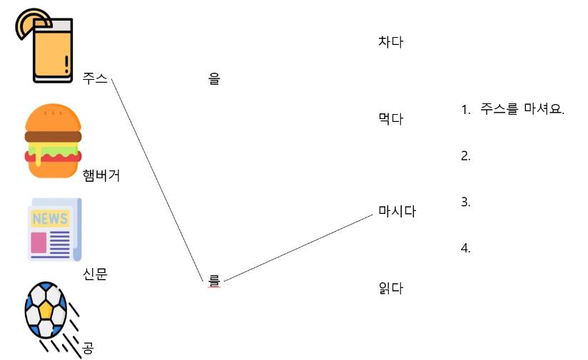 마지막은 항상 학생들이 직접 넣고 싶은 말을 넣을 수 있도록 비워두라는 실습 선생님의 말씀이 있었어요. 그래서 전 늘 이를 실천하려고 노력한답니다. 위에서 한 반복 훈련을 굳이 문법으로 나눠보라면, 'V-아요/어요'가 될 거예요. 학습자들한테는 이 부분을 명시해주는 것도 괜찮대요. 그래야 빠르게 습득할 수 있으니까요. 우리가 영어를 공부할 때, 'would you like to~' 하고 여러 단어들을 대입해 보는 거랑 같은 방식이죠. 어느 정도 이 부분이 학습됐다 싶으면, 그땐 'N을/를'을 추가해서 문장을 만들 수 있도록 확장시켜줍니다. 그러니까, '친구를 만나다'라는 완전한 문장을 제시했던 아까와는 달리, 이번에는 '친구, 만나다'라는 어휘 형태를 제시해서 직접 대답을 해볼 수 있게 말이죠. 아직 초급이라 '을/를'을 헷갈려하니까 이 점도 유의하라고 확실하게 알려주는 것도 잊지 않아야 해요. 너무 간단해서 깜빡할 수 있거든요.