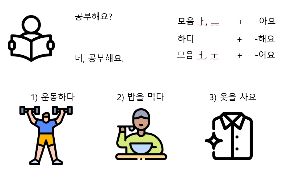 이제 조금씩 어려워지는 게 느껴지시나요? 우린 너무 아무렇지도 않은 문법 규칙인데, 학생들은 복잡해지기 시작합니다. 그래서 최대한 많이 반복해야 해요. 공부해요? 네, 공부해요. 운동해요? 네, 운동해요. 밥을 먹어요? 네, 밥을 먹어요. 옷을 사요? 네, 옷을 사요. 이것 말고도 많죠. 그땐 학생들끼리 주고받을 수 있도록, 선생님은 개입을 하지 않는 방법을 쓸 수도 있어요. 전 그랬거든요. 아직 초급이라 의욕이 뿜뿜(?)인 상태라서, 다들 적극적이니까 더 효과가 좋게 느껴지더라고요. 대신, 여러 가지 상황들을 주는 거예요.