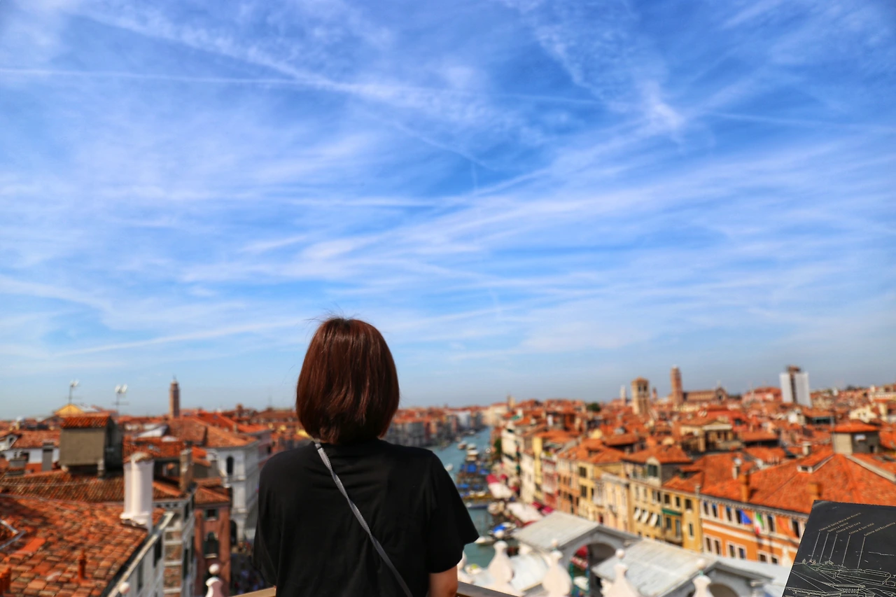 워낙 좁은 동네라서 걷다 보면 지도가 머릿속에 그려지는 지경에 이릅니다. 길치인 저와 동생이 보다 빨리 적응할 수 있도록 해 준 장소가 있었는데, 바로 DFS 전망대였어요. 책과 블로그에서 짧게 소개된 곳이었는데, 베네치아 전경이 내려다보인답니다. 정해진 시간에 옥상을 개방해서 관광객들이 눈과 마음을 활짝 트일 수 있도록 무료로 서비스를 제공하더라고요. 미리 예약하고 가야 해서 날씨가 안 좋으면 어쩌나 걱정했는데, 괜한 짓이었죠. 하늘은 맑았고, 베네치아는 아름다웠으니까요.