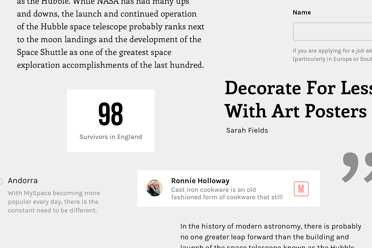 사실 이러한 접근은 주로 디자인 뒷 단, 즉 우리가 시각 요소들 간의 관계에 대해 생각하며 더 많은 시간을 투자할 수 있는 디자인 마감 단계에서 많이 사용된다. 하지만 프로토타입이나 와이어 프레임을 제작하는 프로젝트 초기에서부터 이 접근 방식을 사용한다면 디자인과 개발 모두에 더 잘 적용될 수 있음을 의미하게 된다.