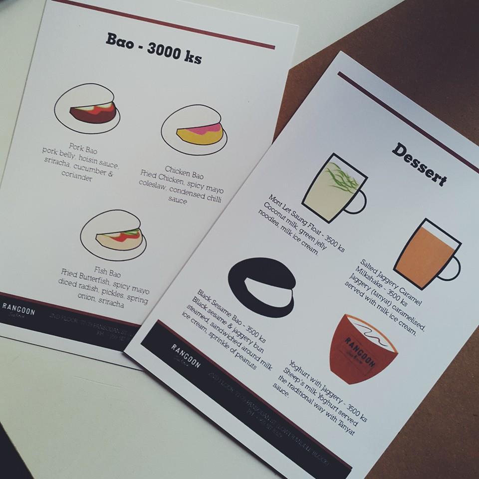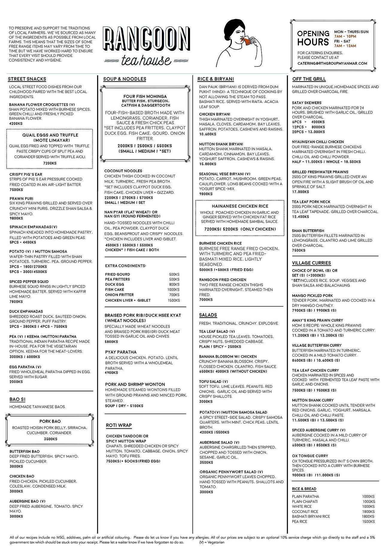 미얀마 전통티 외, 미얀마 전통 음식들 중 랑군티하우스에서 인기있는 메뉴인 바오(Bao)라는 동양식 햄버거와 이국적인 향의 치킨라이스 커리 찜밥(Chicken Biryani) 그리고 한번 맛보면 멈출 수 없는 고소한 견과류가 같이 버무려진 찻잎 샐러드 Tea Leaf Salad (Plain)는 반드시 먹어봐야하는 음식이다.