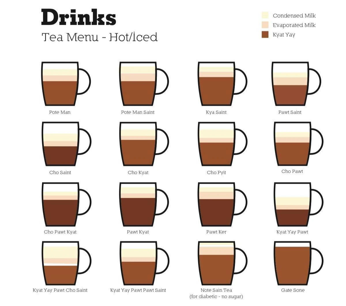 미얀마는 티 문화가 발달한 나라들 중 하나이다. 미얀마에 방문한 여행객들이 기념품으로 혹은 선물용으로 제일 많이 구매하는 제품이 '미얀마 티'일 정도로 유명한 미얀마 전통티는 현지어로 La Phet Yay (라펫예)라고 불리는데 맛은 달달한 밀크티라고 생각하면 된다.