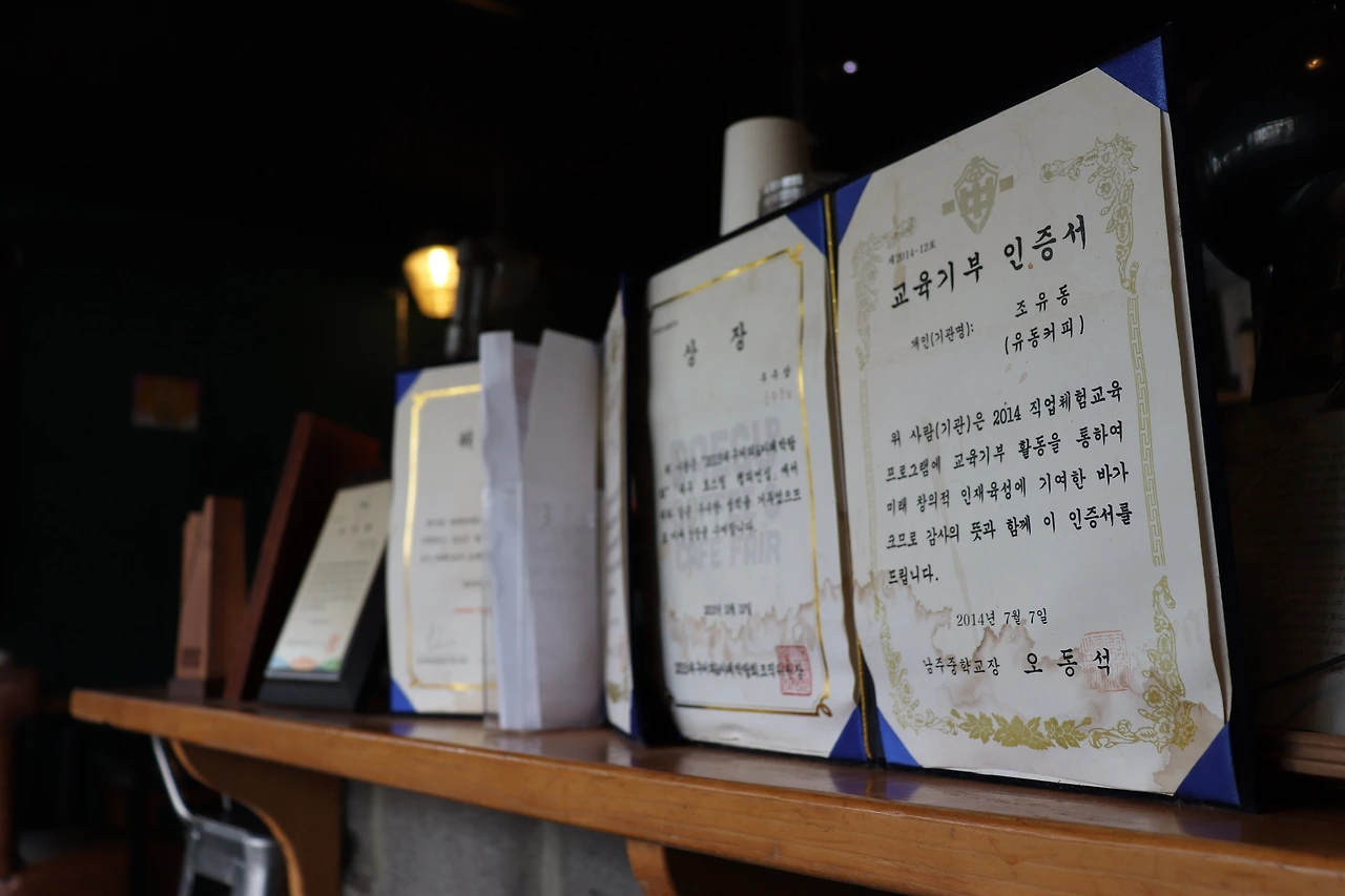 제주 이중섭거리를 방문한다면 꼭 들려야하는 커피 전문점이 있다. 이중섭 거리 주변에 위치한 커피 전문점인 '유동커피'이다. 제주를 대표하는 커피 전문점이라는 수식어를 증명하듯 커피숍 내부에는 당당히 자리한 상장과 상패를 볼 수 있다.