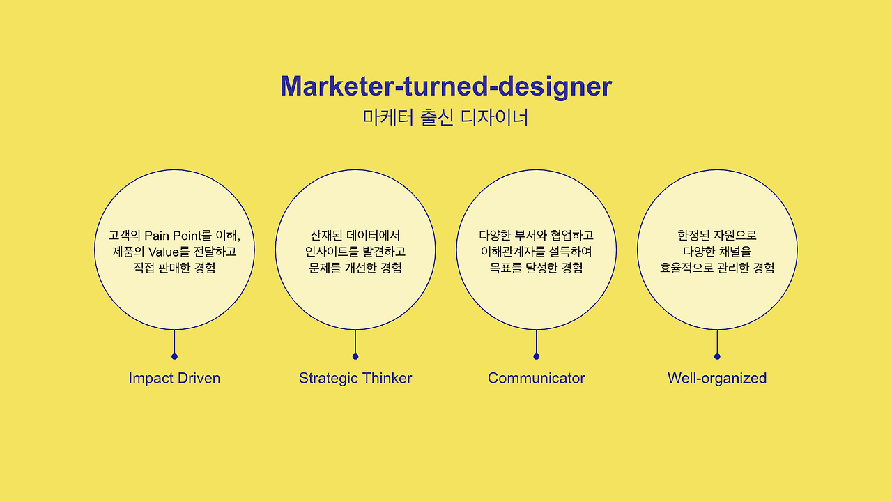 그리고 여기서 만든 Marketer-turned-designer (마케터 출신 디자이너)는 나만의 태그라인(일종의 브랜딩 슬로건)이 되어 링크드인, 이력서, 포트폴리오 모두에 노출되도록 했다. 이렇게 하면 나를 인터뷰 본 사람은 ‘아, 그 마케팅했던 애'로 나를 기억할 수 있다. 실제로 구직 시절 포트폴리오 피드백을 해주는 이벤트에서 운 좋게 내 것이 예시로 소개됐는데, 패널들이 ‘Nice catchphrase”라고 칭찬을 해주어 어깨가 하늘까지 솟았던 기억이 있다.