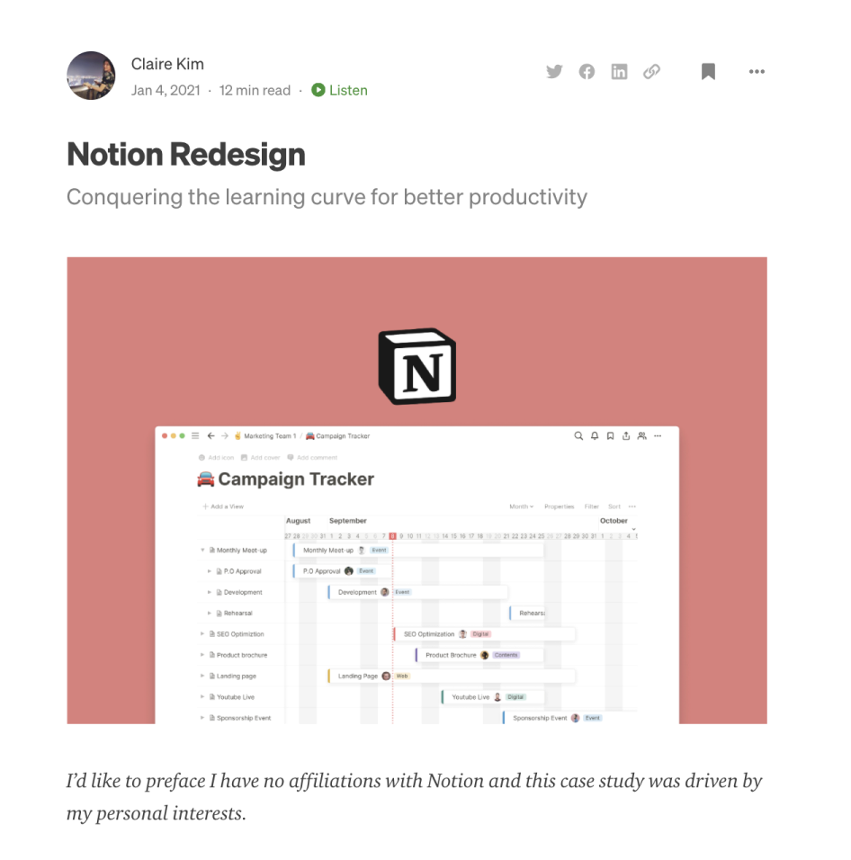 나는 이것을 Medium이라는 공개된 플랫폼에 기재했다. 공개된 채널을 활용해야 더 많은 사람들에게 내 작업물을 노출시킬 수 있다는 생각 때문이었다. 그런데 예상보다 훨씬 반응이 좋아서, 이 케이스 스터디 하나로 총 5군데의 인터뷰 요청을 받았다. 심지어 Notion의 디자이너와도 얘기할 기회가 있었다. (아쉽게도 채용으로 이어지진 않았지만)