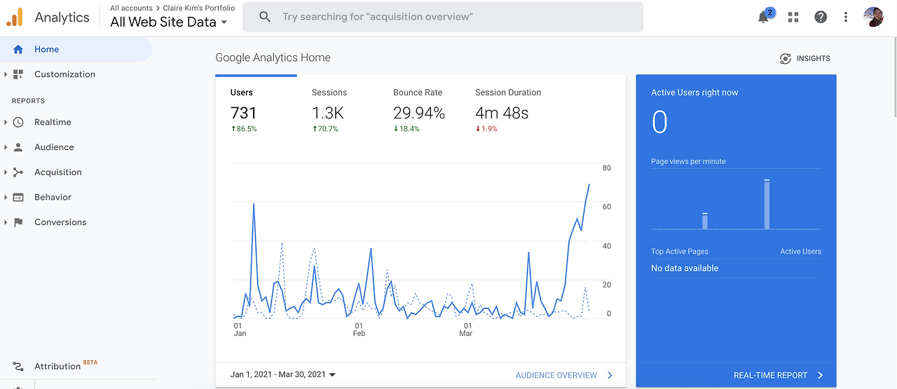 포트폴리오를 찾는 방문자를 분석하지 않는다는 것은 포트폴리오의 유저를 생각하지 않는다는 것이나 다름없다. 내 포트폴리오를 방문하는 사람들을 이해해야, 올바른 방향으로 개선할 수 있다. 이를 위해 나는 Google Analytics를 연동하는 것을 추천하는데, GA라고도 불리는 이 웹 로그분석 도구를 활용하면 방문자가 어느 루트를 통해 들어왔는지, 몇 분을 머무는지, 어느 페이지에서 나갔는지, 심지어 사용하는 브라우저 크기는 무엇인지 등 너무나 유익한 정보를 파악할 수 있다. 예를 들어 만약 방문자의 상당수가 나의 대표 프로젝트 페이지에서 1분도 머무르지 않는다면, 그 말은 곧 내 작업물이 매력적이지 않거나 보여주는 방식이 잘못되었다는 것을 의미한다고 볼 수 있을 것이다. 이처럼 방문자의 행동 패턴을 파악한다면 더 나은 경험을 제공하기 위한 실마리를 찾을 수 있다.