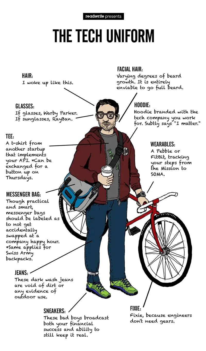 샌프란시스코 베이 지역 (Bay Area), 즉 실리콘밸리는 패션과는 거리가 멀다. 스티브잡스나 마크 주커버그를 떠올려보라. 모두 멋과는 거리가 먼, 간편한 옷차림을 한 것을 알 수 있다. 온라인에 떠돌아다니는 이 짤이 나는 이곳의 현황을 적나라하게 보여준다고 생각한다.