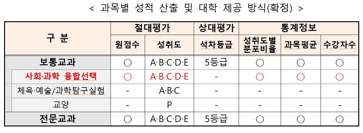 아래 표는 2028 입시부터 대학에 제공될 고교 과목별 성적 산출방식을 정리한 것이다. 보통교과 과목에서 1) 사회·과학 융합선택 과목은 원래 취지에 맞게 성취도로만 평가된다. 그리고 2) 원래 절대평가되던 4개 분야의 교과목-예체능, 교양, 과학실험은 그대로 성취도로 평가된다.