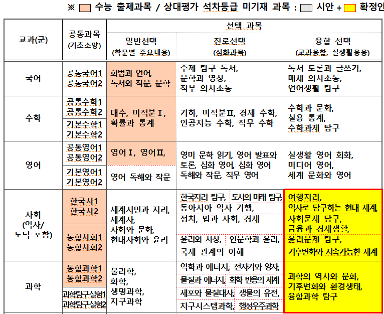 첫째 그룹은 살구색 상자에 묶인 과목들로, 2028학년도부터 수능에서 출제되는 과목이다. 문과생, 이과생 조건에 상관없이 모든 수험생이 동일하게 치르게 된다. 사회 및 과학은 1학년 때 듣는 공통과목에서 수능 문제가 출제되며, 국/영/수 주요 과목 및 제2 외국어/한문은 일반 선택과목으로 분류되어 주로 2학년 때 듣는 과목에서 수능 문제가 출제됨을 짐작할 수 있다. 또한, 이 과목들 모두 상대평가인 5등급제와 성취도 평가인 절대등급이 병기된다.