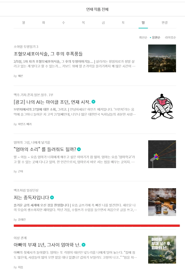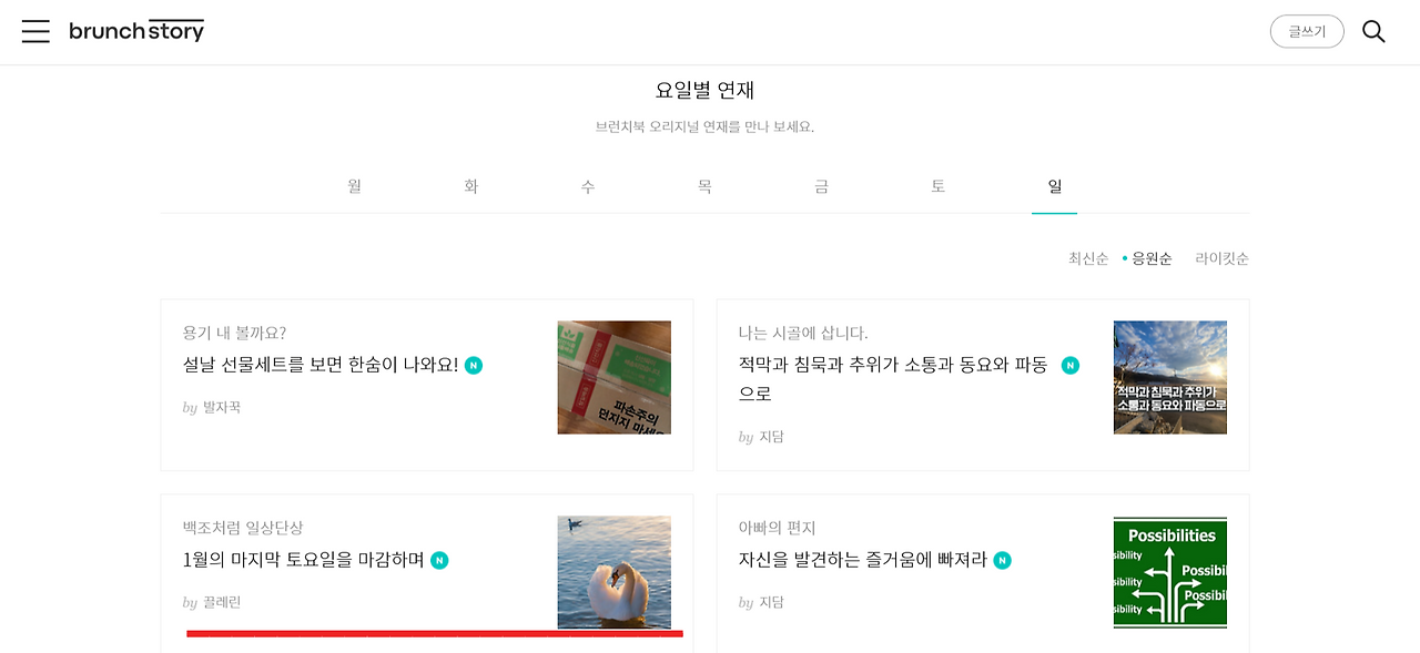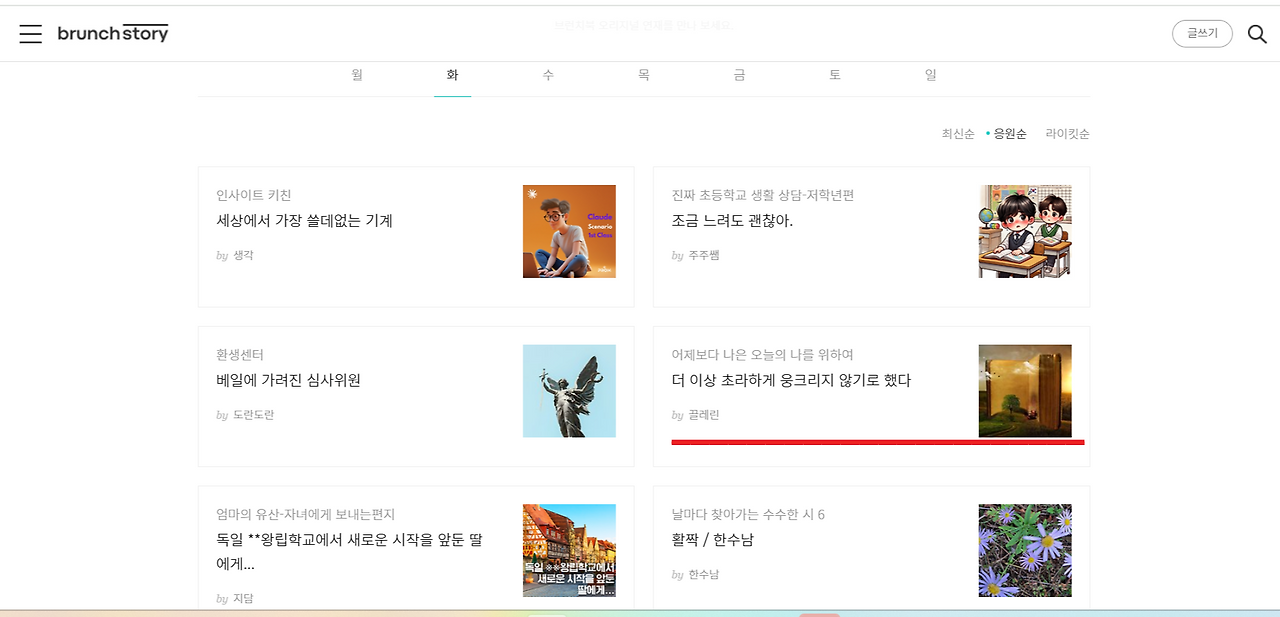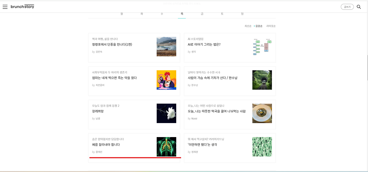 그 외, 일상 수필과 폐암 투병기, 브런치 글쓰기 중독에 대해 쓴 글까지 총 네 편이 요일별 상위권에 올랐습니다.