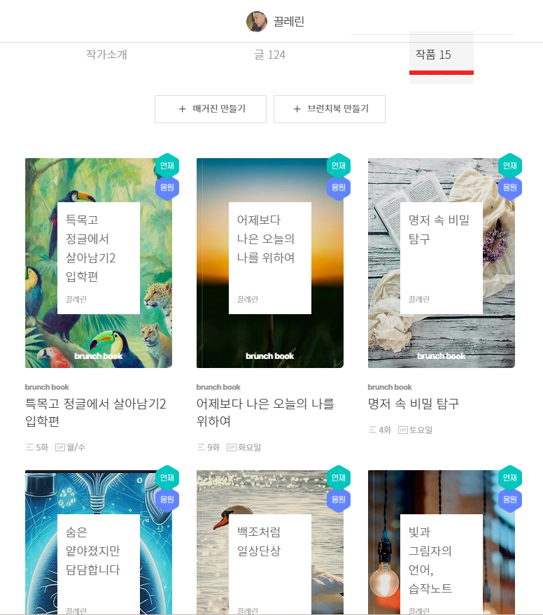 그리고 6개의 브런치북을 연재하면서 작품수는 한 달 전의 12개에서 15개로 늘어났어요.