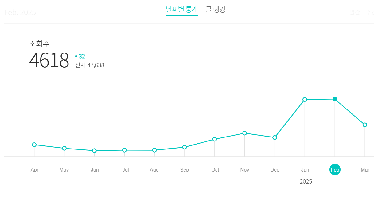2025년 2월의 마감 통계를 보면 조회수는 4,618회로 1월 4,586 회에 비해 소폭 증가했어요. 아직 갈 길이 먼가 봅니다.