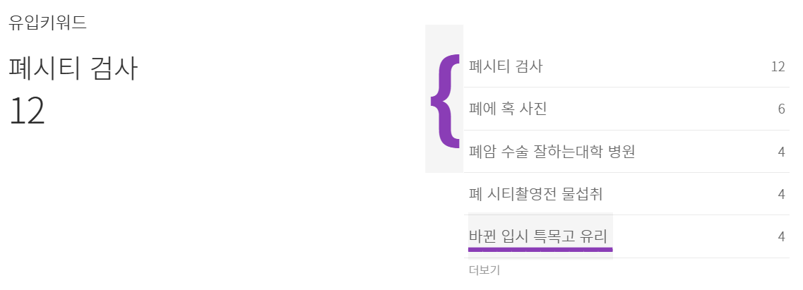 그런데, 2월 브런치 유입의 12.5%를 차지하는 검색 중에서, 키워드 상위를 보면 의외로 '폐시티 검사'와 '폐암' 관련된 검색어들이 많습니다.