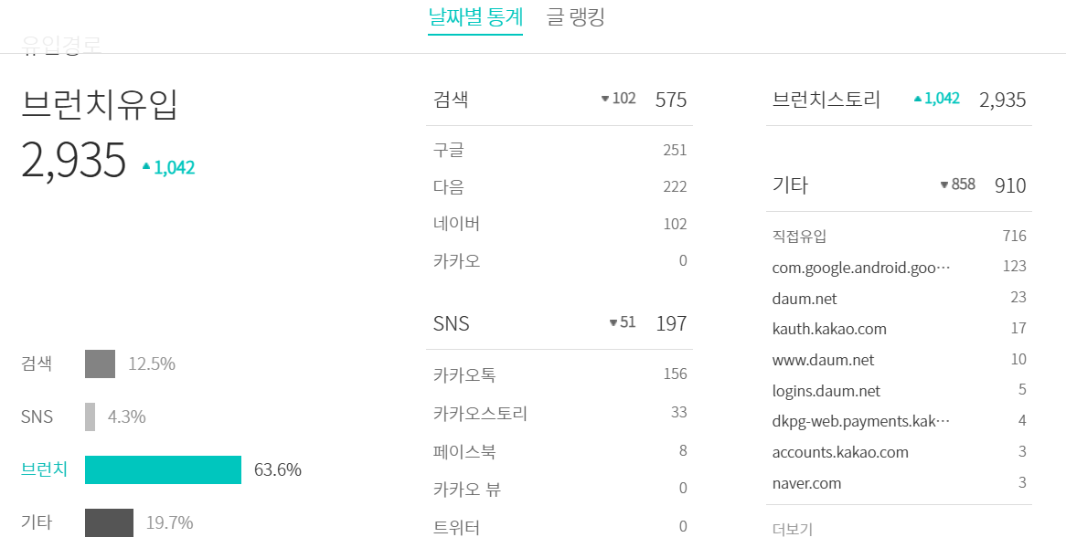2월 브런치 유입경로도 1월처럼 여전히 브런치에서 조회한 비율이 63.6%로 가장 높습니다.